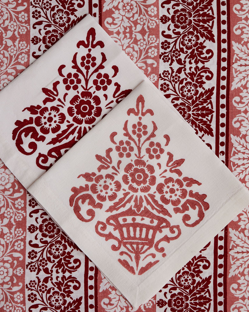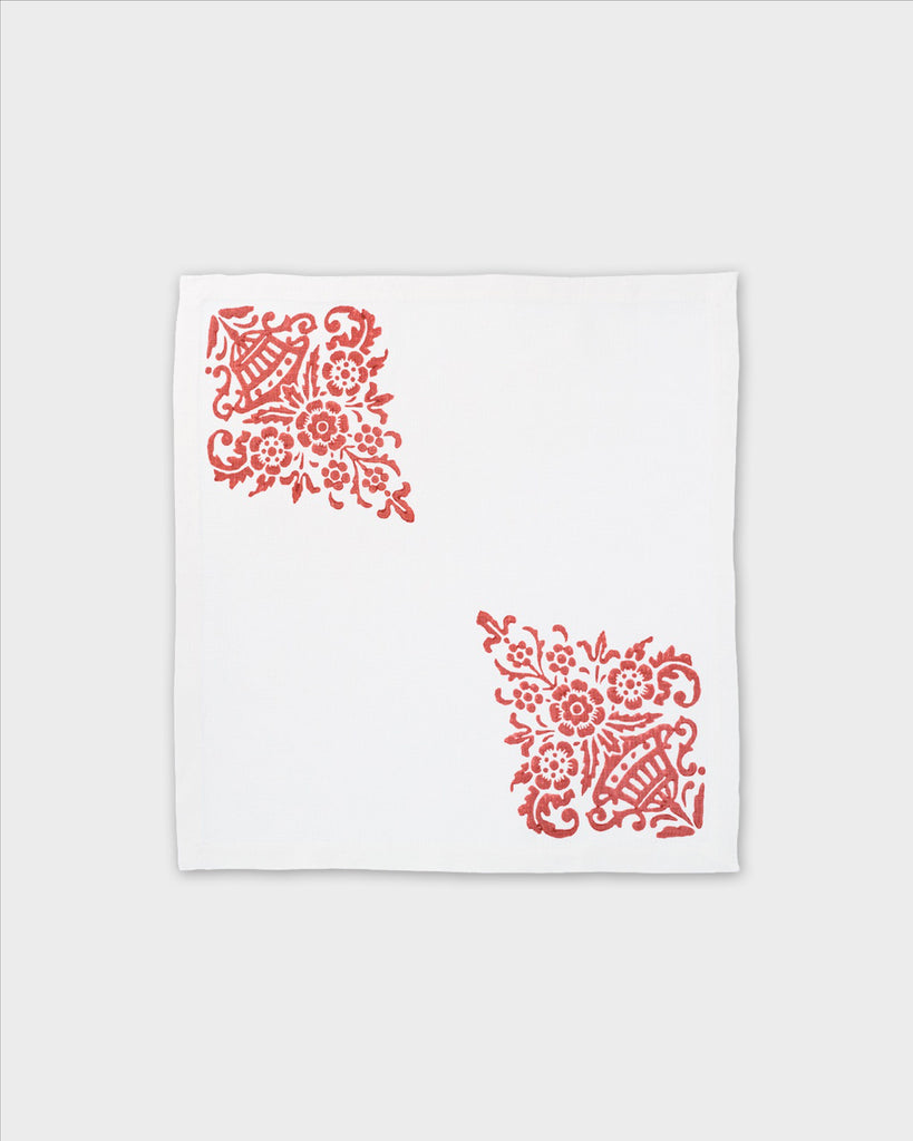 These unique napkins are printed by hand on 100% linen using wooden blocks, a historic tradition kept alive in Italy by a small cadre of master artisans. Crafted in Emilia-Romagna, the Mirandola napkin features an ornate floral motif that stands as a testament to the superior quality of traditional craftsmanship. Set of 4.