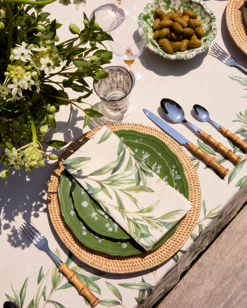 Created in collaboration with Gwyneth Paltrow, this exclusive table linen celebrates California’s effortless indoor–outdoor lifestyle.Crafted in Italy from 100% linen, each piece carries an olive motif inspired by hillside groves and golden afternoons. Perfect for long lunches, or al fresco dinners that flow seamlessly from daylight to candlelight, these linens are designed for easy, beautiful entertaining.