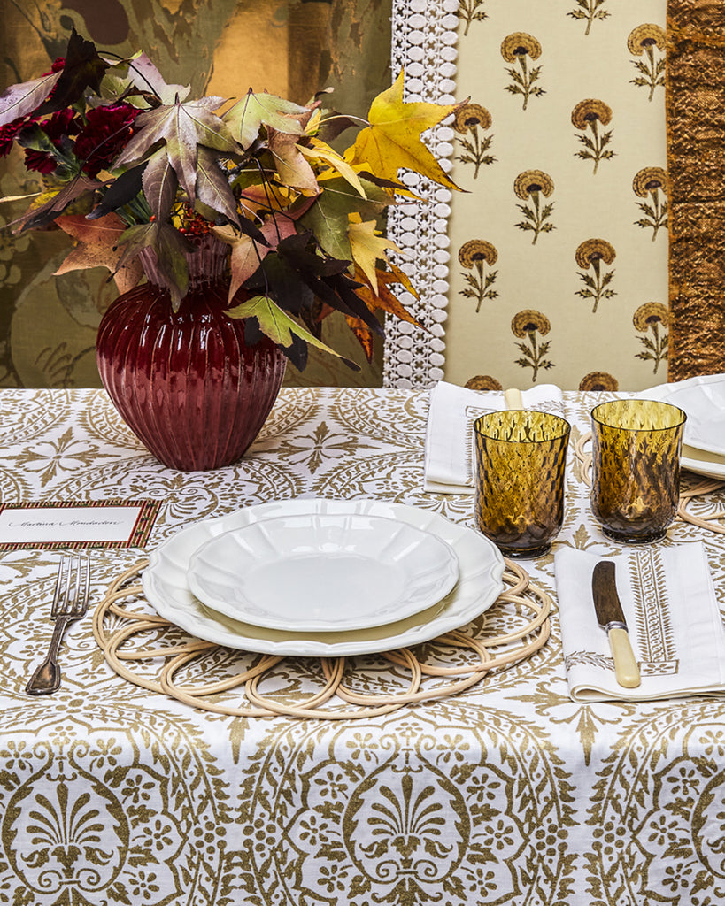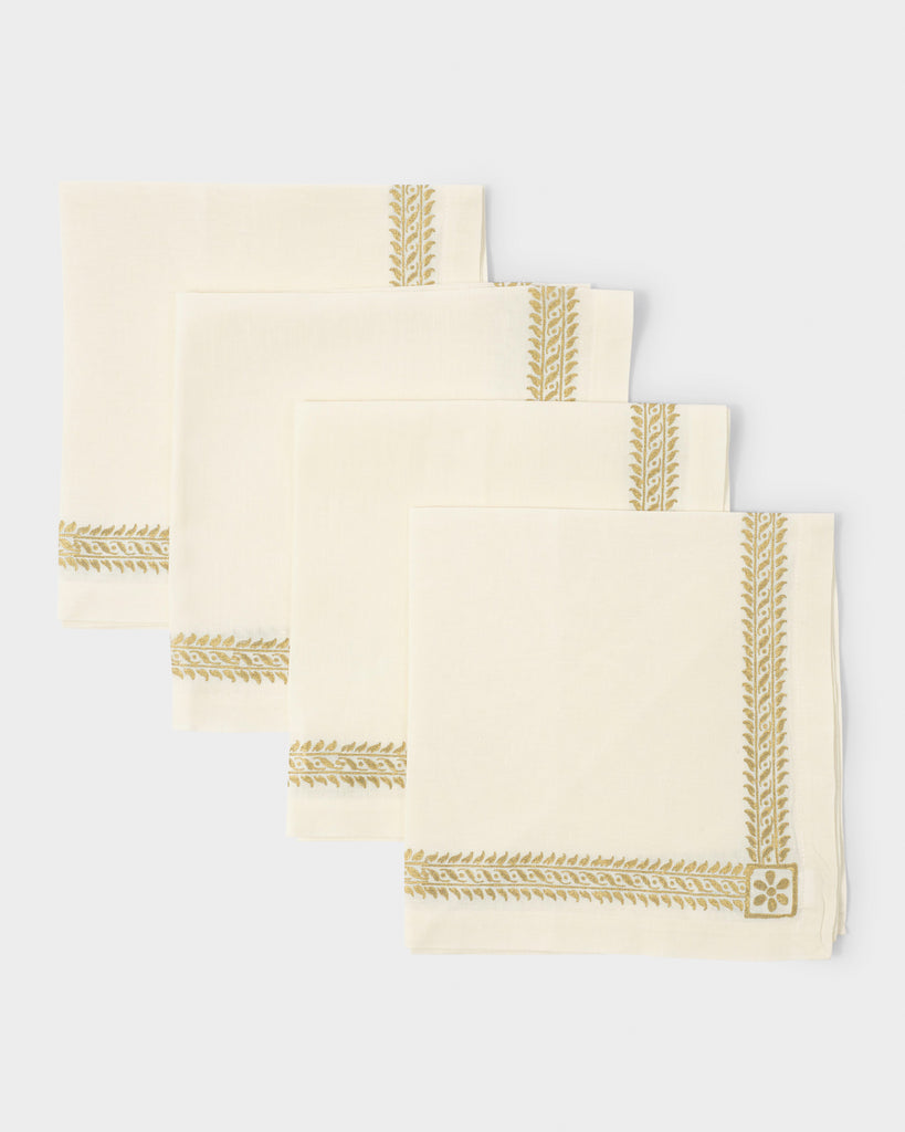 These elegant napkins are hand-printed using wooden blocks, an ancient tradition kept alive in Italy by a small cadre of master artisans. Inspired by a 15th century Sienese painter, they feature a classical ornamental pattern in gold. Add to your table to create a refined, old world glamour for your festive table setting. Set of Four.