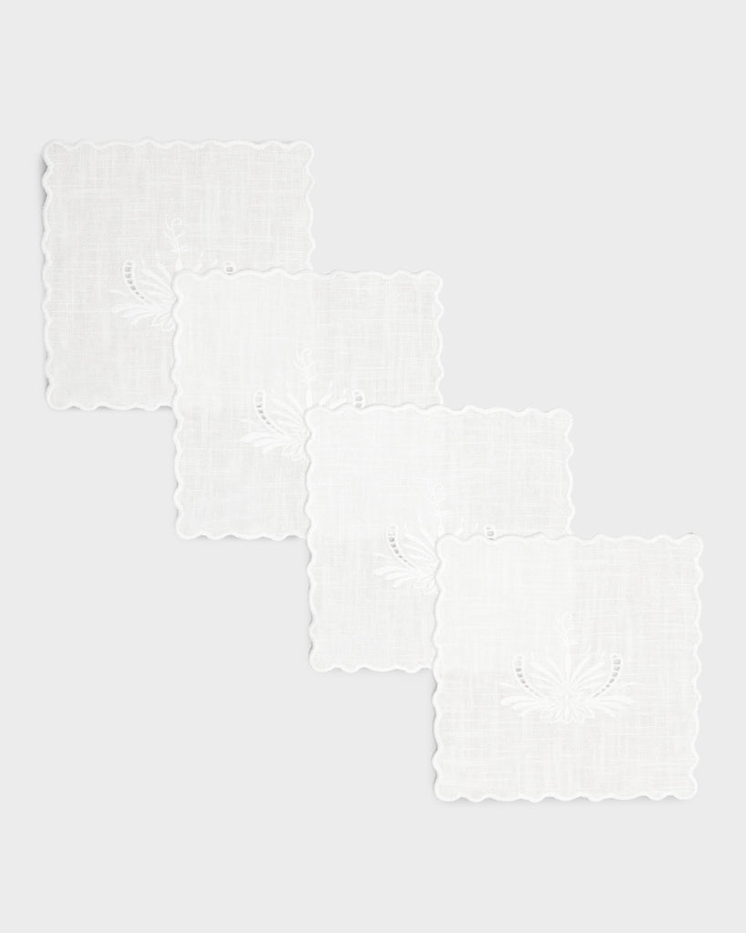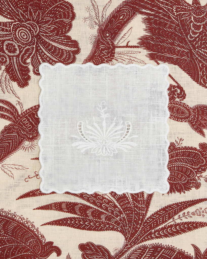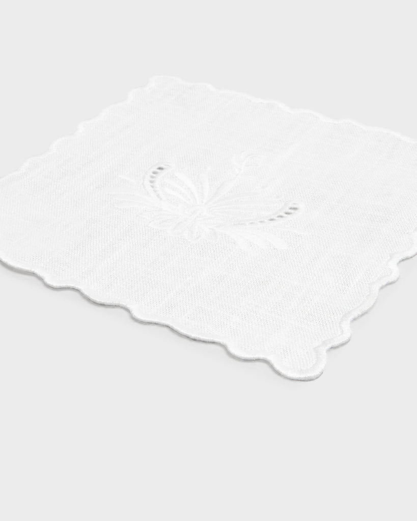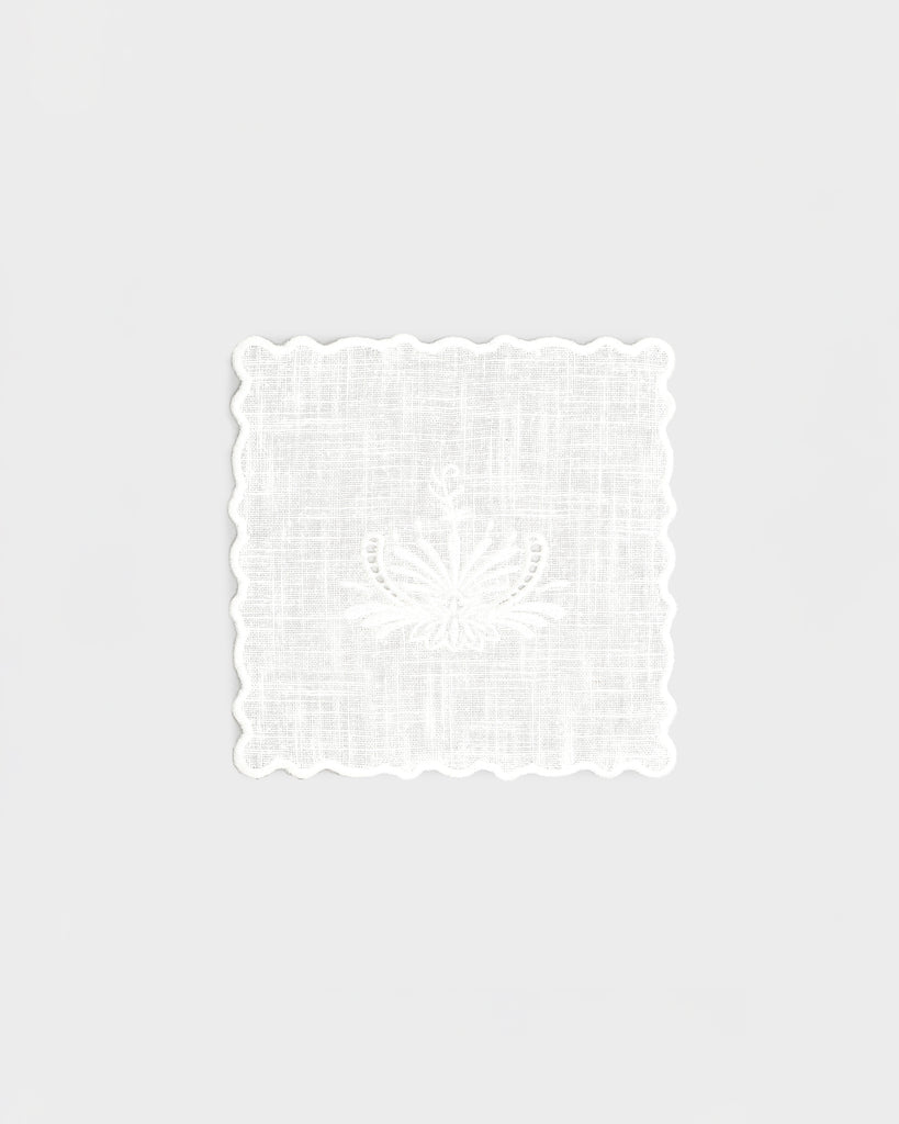 The Ulla Johnson x Cabana Ajour Emboridered Cocktail Napkins are crafted from 100% linen, featuring a beautifully embroidered swirling floral design, accented with delicate perforations. The scalloped edges further enhance its artisanal charm, offering a sophisticated touch to any table setting.