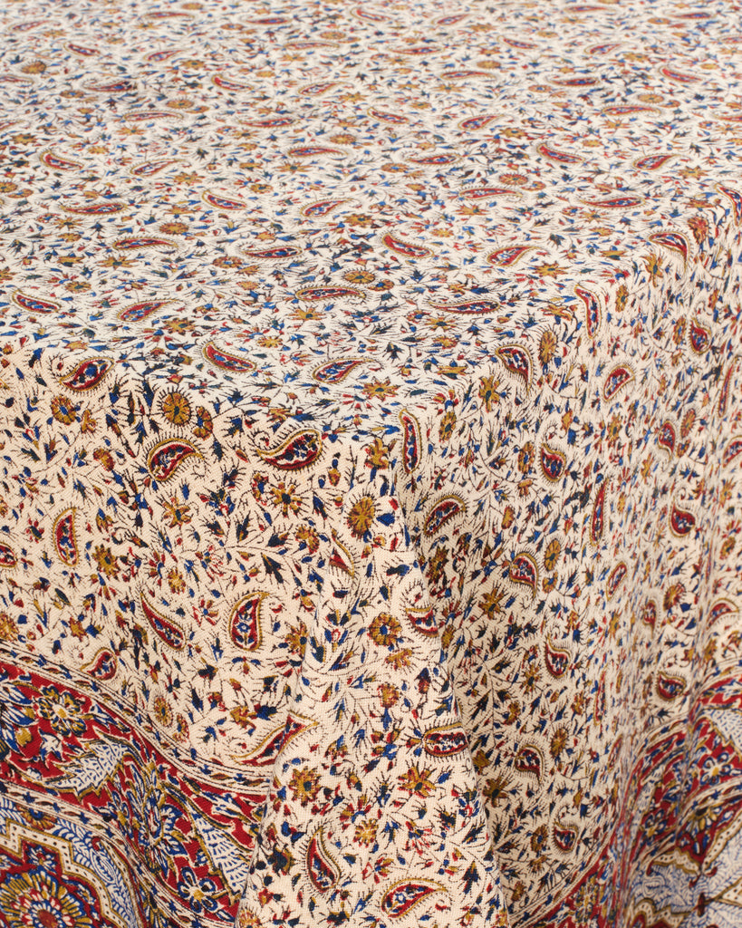 Ghalamkar is one of the oldest textile crafts featuring ornate hand-printed designs on pure cotton, 'ghalam' meaning pen and 'kari' craftsmanship. The rich patterns recalls the ambiance of Ottoman interiors and is versatile in any space. Variations in finish or appearance are not considered imperfections, rather the mark of a unique handmade item.