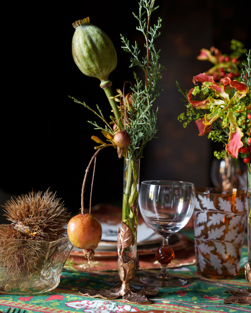 Italian designer and maker, Osanna Visconti, casts exquisitely detailed jewellery and objects, both functional and decorative, from natural bronze using the lost wax technique - an ancient method that Greek and Roman artisans have been using since bronze was discovered 3000 years ago. The Foglie Bud Vase Bronze is a timeless piece inspired by nature and will surely be a lasting treasure. Discover Osanna's collection of bronze works including candlesticks, bowls, serving spoons, tea spoons and more. Please note that candles are not included.