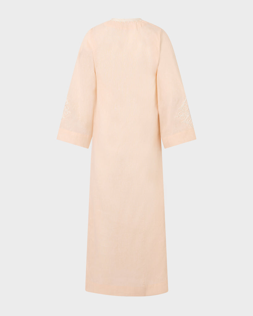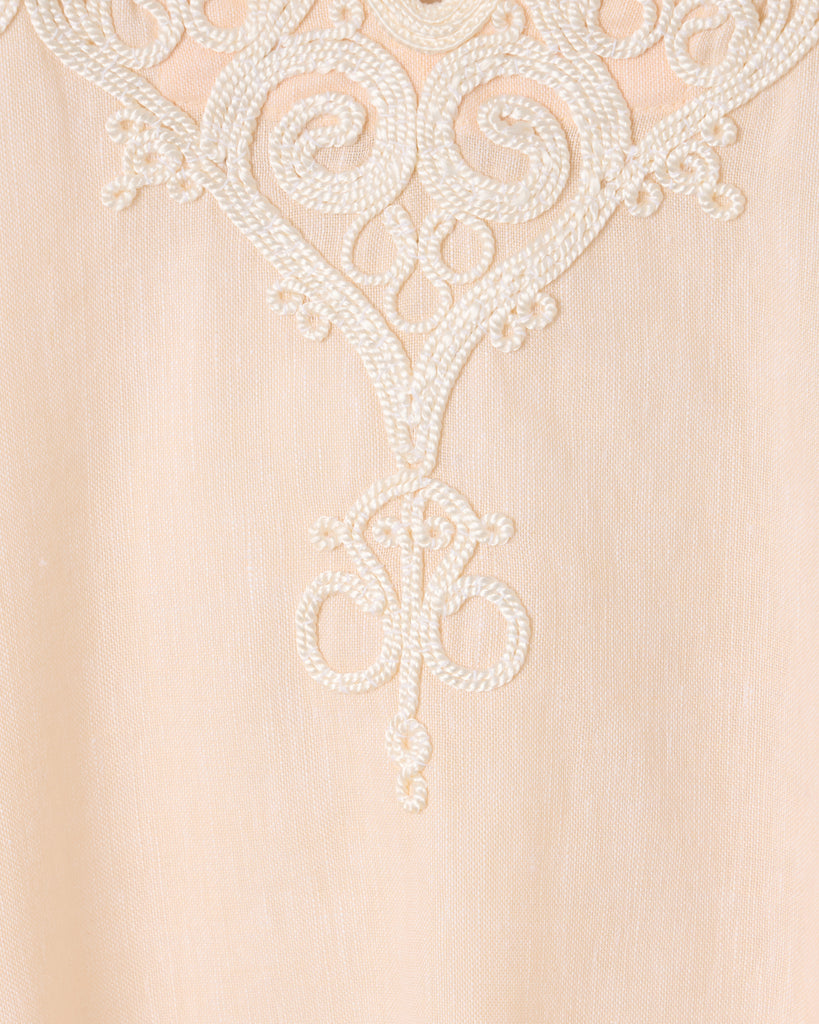 The Mamlouk Kaftan is crafted in collaboration with Malaika Linens & Madu, using the finest Egyptian linen and hand-embroidered by Malaika’s women-led cooperative in Cairo. Featuring a traditional Mamlouk cording technique, it is lightweight, breathable, and perfect for summer.