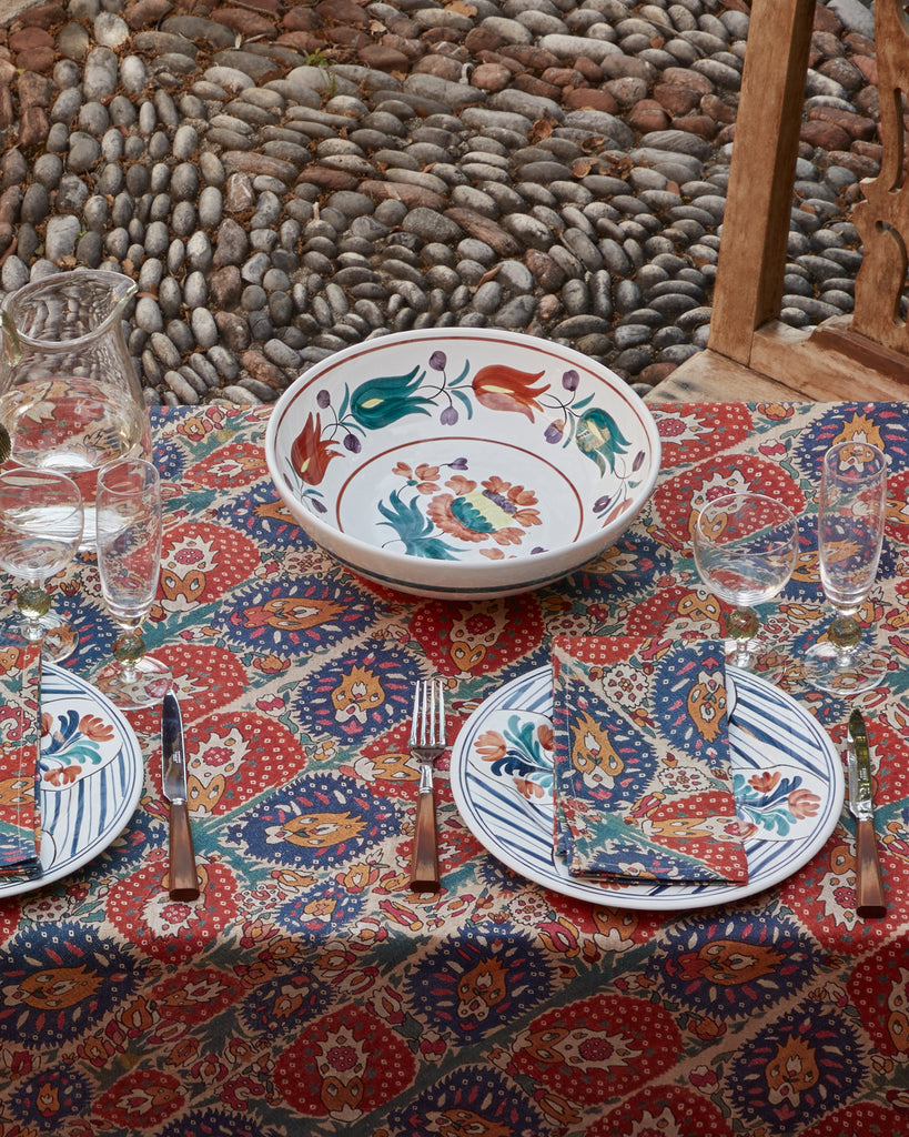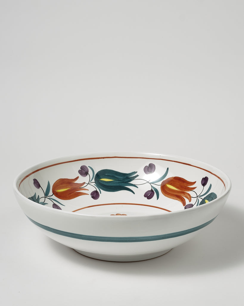 The Lia Serving Bowl is inspired by the traditional textiles, motifs and pottery found in the esteemed Benaki Museum of Greek Culture in Athens. Hand-painted by artisans in Umbria, it features a central motif framed by a border of florals.