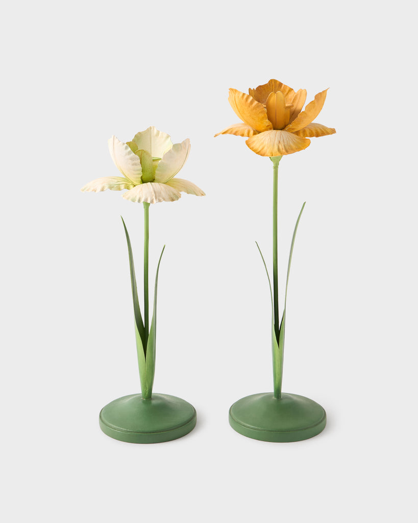 The Daffodil Painted Metal Candle Holder in white is crafted from hand-painted metal with a soft, matte finish. Its sculptural shape brings a playful, whimsical element to both table settings and living spaces.