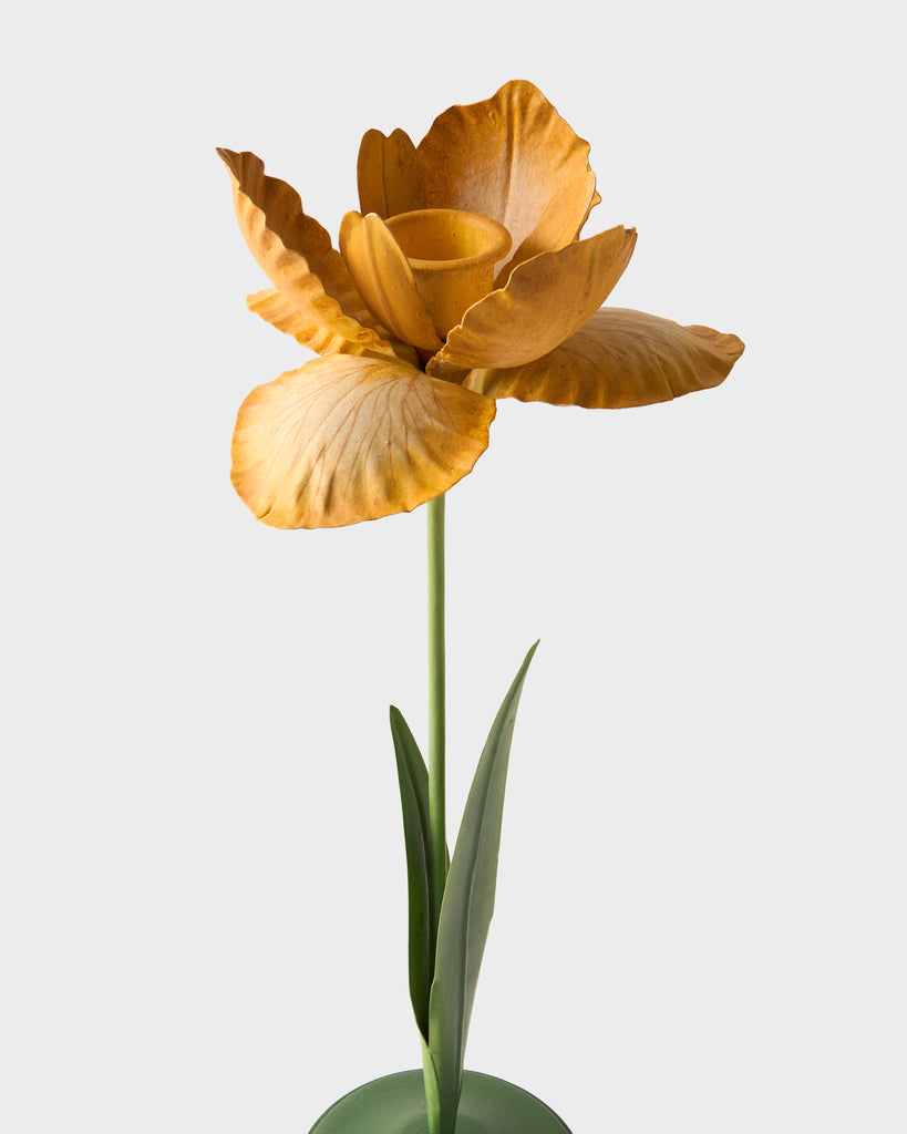 The Daffodil Painted Metal Candle Holder in yellow is crafted from hand-painted metal with a soft, matte finish. Its sculptural shape brings a playful, whimsical element to your table settings.