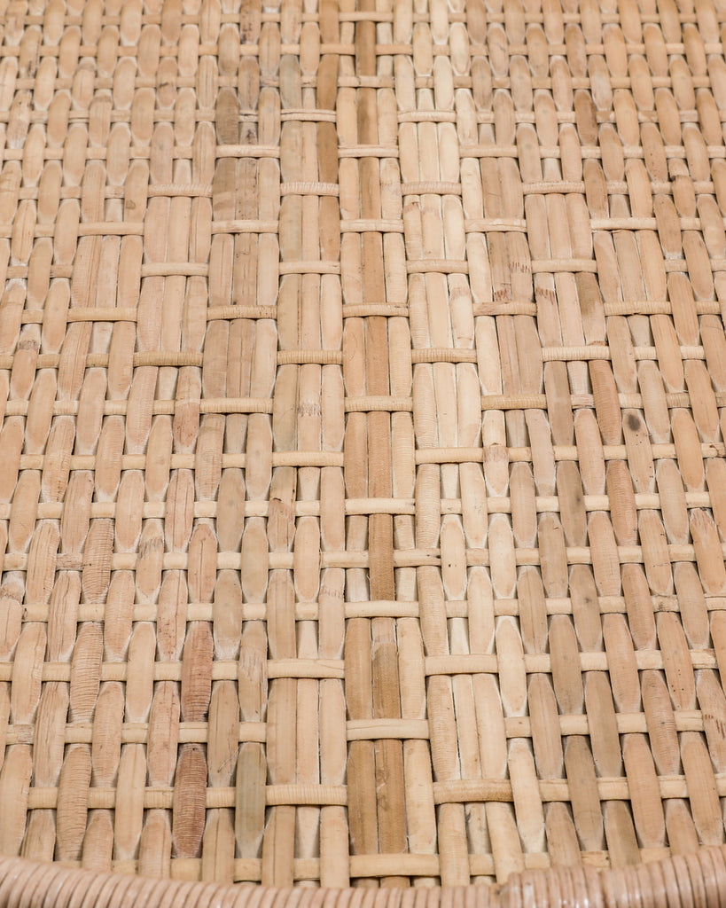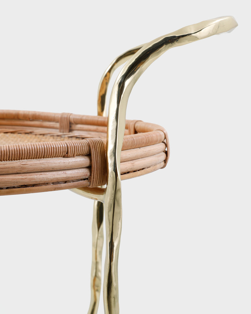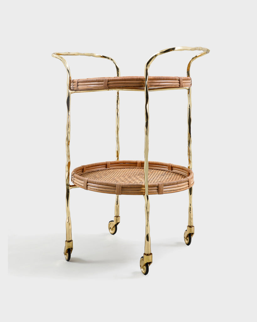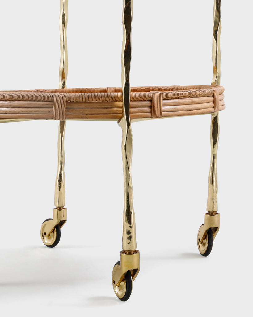 This woven cane and brass trolley is designed by the Assam collection studio, exclusively handcrafted in India. A contemporary expression of traditional craftsmanship from North East India, the trolley pairs gleaming forged brass rods with intricately handwoven cane. Elegant yet practical, it makes a refined addition to any space, perfect for use as a serving cart or drinks trolley.