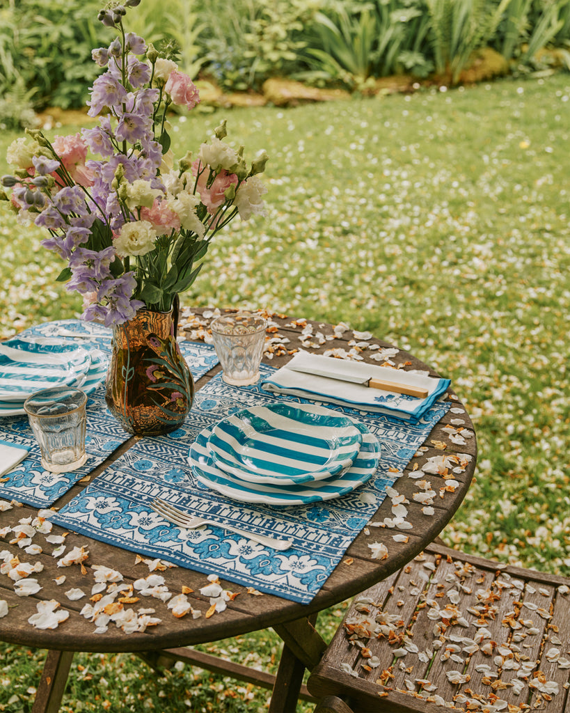 Inspired by indigo block prints originating from India, the Malabar Placemats feature a vintage calico floral design in a symphony of blues. Each placemat is made with 100% linen. Exclusively for Cabana.