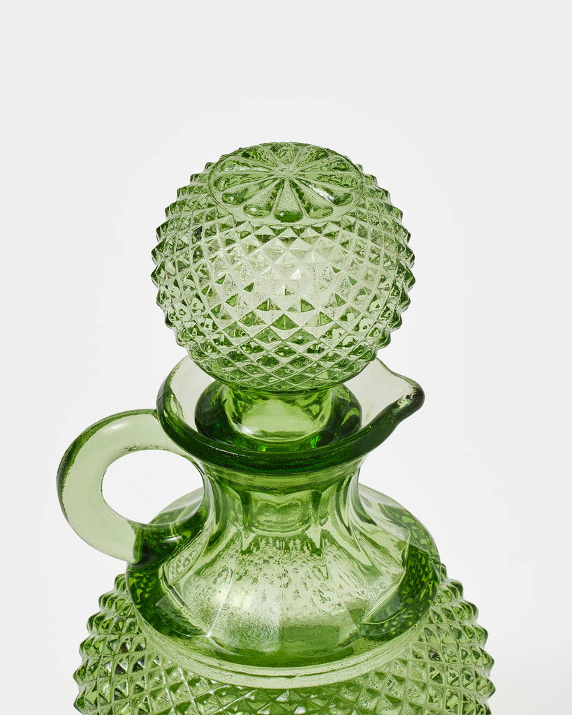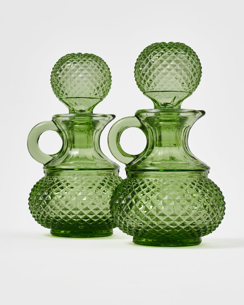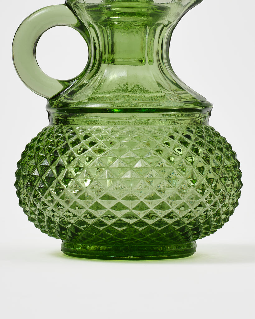 This elegant-yet-playful oil and vinegar set is made from fine quality glass and is hand-blown in Portugal, a country with a rich history of glass manufacture that reaches back to the 18th century. Each piece features a classic finely-hatched diamond pattern whose gravitas is contrasted with delicate details on the neck, and a small circular handle.The solid bottle-olive colour brings a touch of tradition to kitchen counter and table-top alike.
