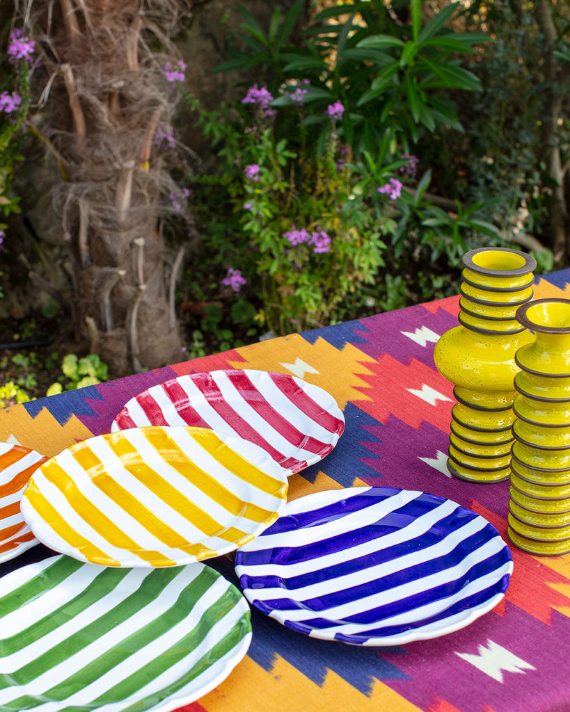 Handcrafted in Umbria, the Righe plate is a playful addition to your table. Mix and match colors to create a vibrant table setting. The colorful stripes will allow you to combine these plates with any items you may want. From a simple white tablecloth to a fun floral one, the possibilities are infinite.