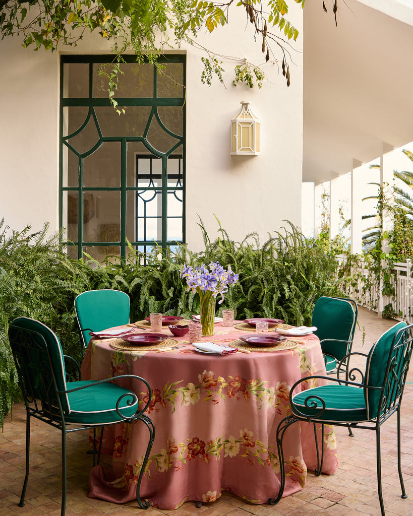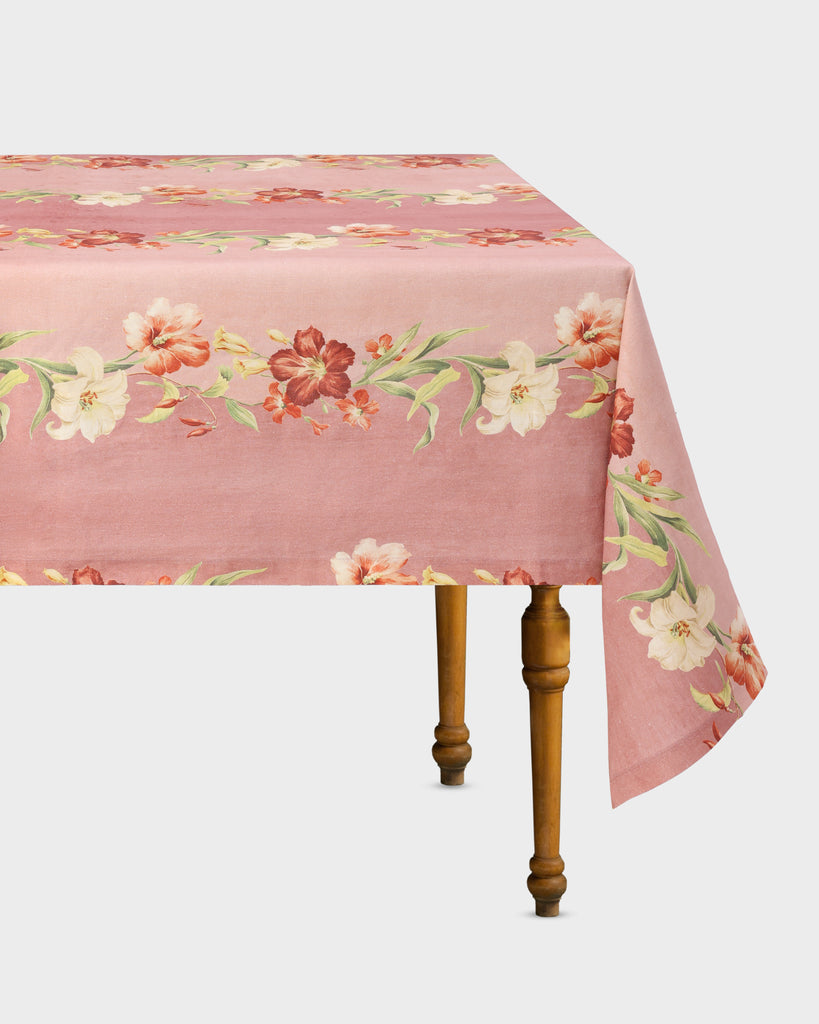 Elevate your dining with our Hibiscus Colony Tablecloth, blending a romantic charm and elegant whimsy. The pastel pink and green is designed exclusively for The Colony Hotel in Palm Beach, and lends itself to the early days of Southern Florida aesthetic with its bountiful floral motifs. Exclusively at Cabana and The Colony Hotel.