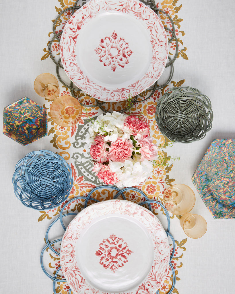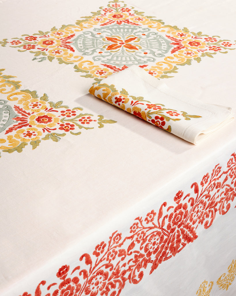 The Mirandola tablecloth features a hand-stamped central pattern in subtle shades of green, red, and gold. Its edges are further adorned with two repeating floral motifs. We at Cabana love these tablecloths for the exquisite craftsmanship they display in such stylish evidence. Perfect for either formal dinners or casual lunches with friends, the Mirandola tablecloth is sure to delight all seated around it.