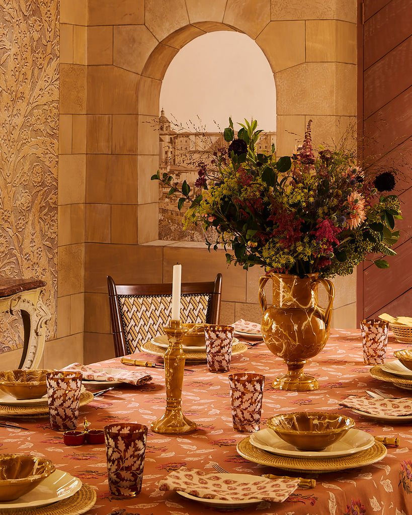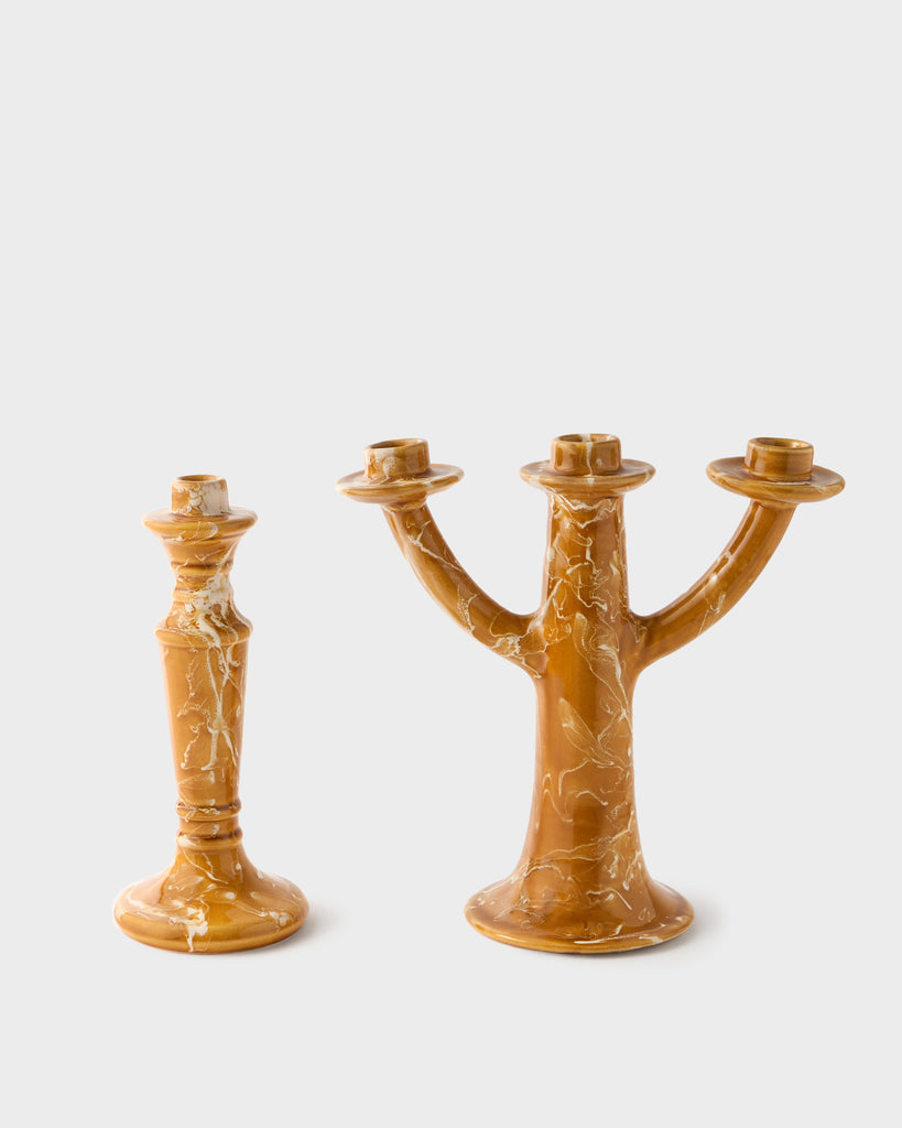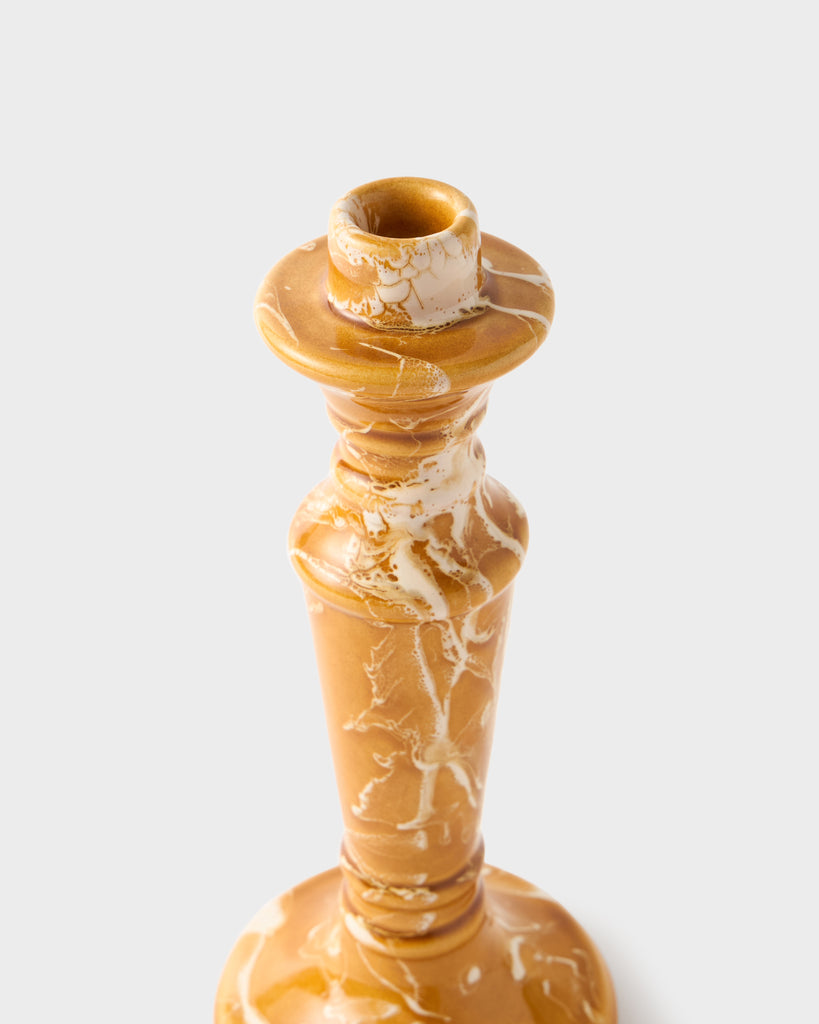 The Terracotta Collection is a stunning ode to Italy's visual identity, defined by the rich, earthy tones of the country’s natural landscape, its celebrated terracotta rooftops and sunbaked joie de vivre. The Marbled Candle Holder is hand-painted in Puglia using the traditional 'schizzato' speckled technique. It has a classic curved shape and features a marbled pattern in warm hues. Each piece is hand-dipped, resulting in a distinctive marbled finish that celebrates the artistry of Italian craftsmanship.