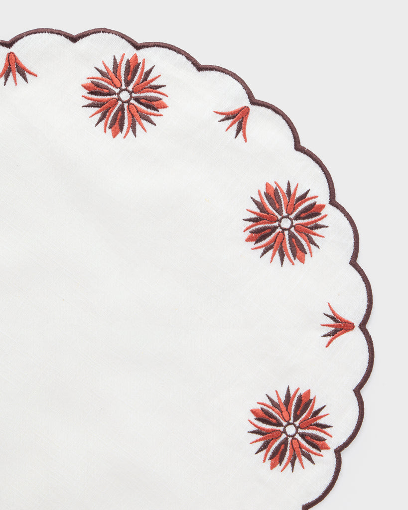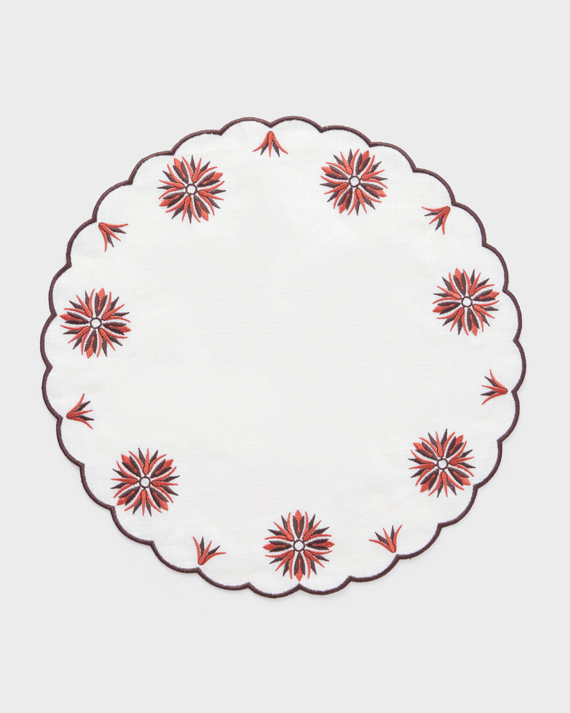 Add elegance to your table with the Botanica Embroidered Placemat and Napkin Set in Burgundy. Featuring soft linen napkins with a scalloped border and floral motif, paired with a matching round placemat, this set brings timeless sophistication to any dining experience.