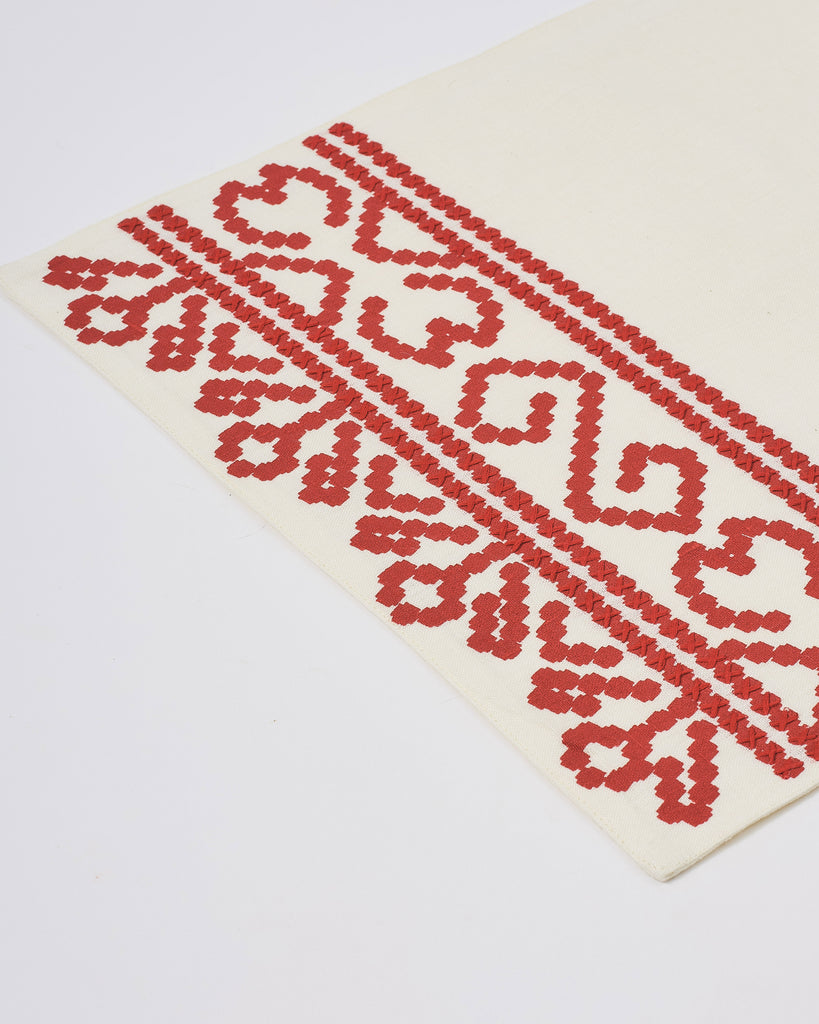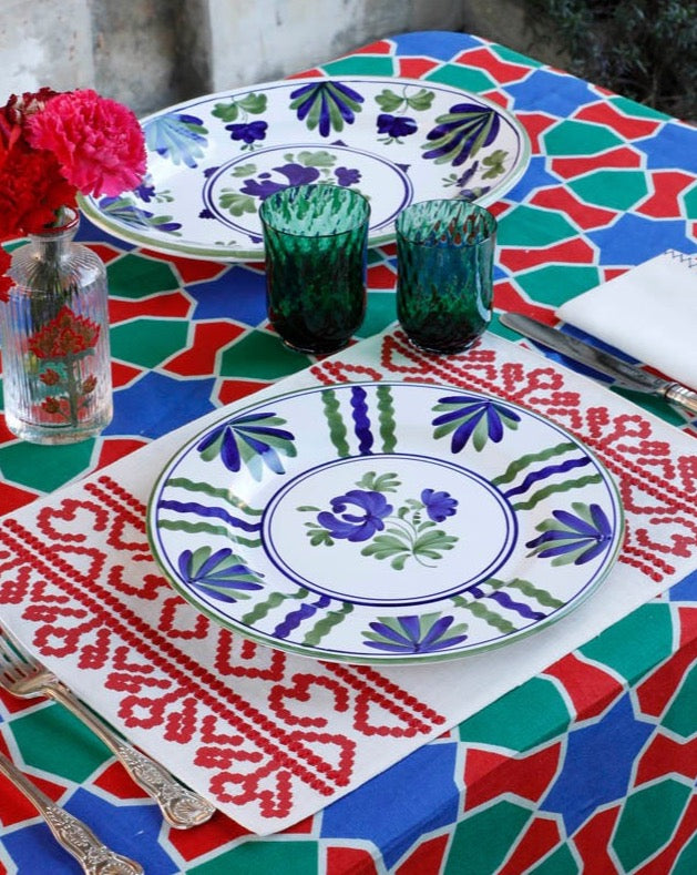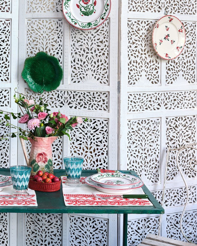 The Goya placemats are screen-printed and hand-embroidered by the small team of local women at Malaika Linen’s workshop on the outskirts of Cairo. Their striking motifs, rendered in a vivid red, pay homage to local decorative traditions while also embodying a modern boldness.