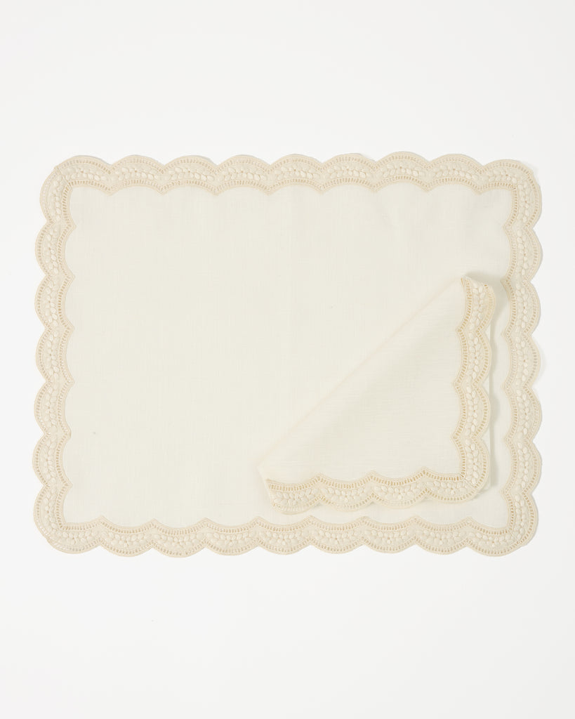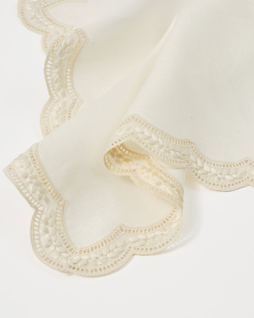 The Emilia Scallop Embroidered Napkin is hand embroidered in Tuscany featuring a scalloped pierced edge embellished with a subtle floral motif. Crafted in 100% linen and hand-dyed in an elegant cream color, the delicate texture of the fabric and design evokes an old-world charm, ensuring an elegant dining experience.