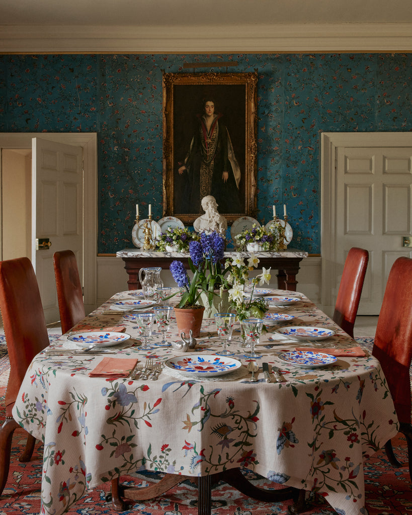 Owing to a mutual passion for interiors and true artisanal craftsmanship, together Rose, The Marchioness of Cholmondeley, and Martina Mondadori have created a tabletop collection inspired by original artefacts at Houghton Hall, North Norfolk. The collection includes table linens inspired by Rose’s 18th century hand painted silk bedroom wall covering, alongside napkins, porcelain plates and silver swans. All objects are carefully made in Italy following months of creative collaboration between the two design conspirators and friends.