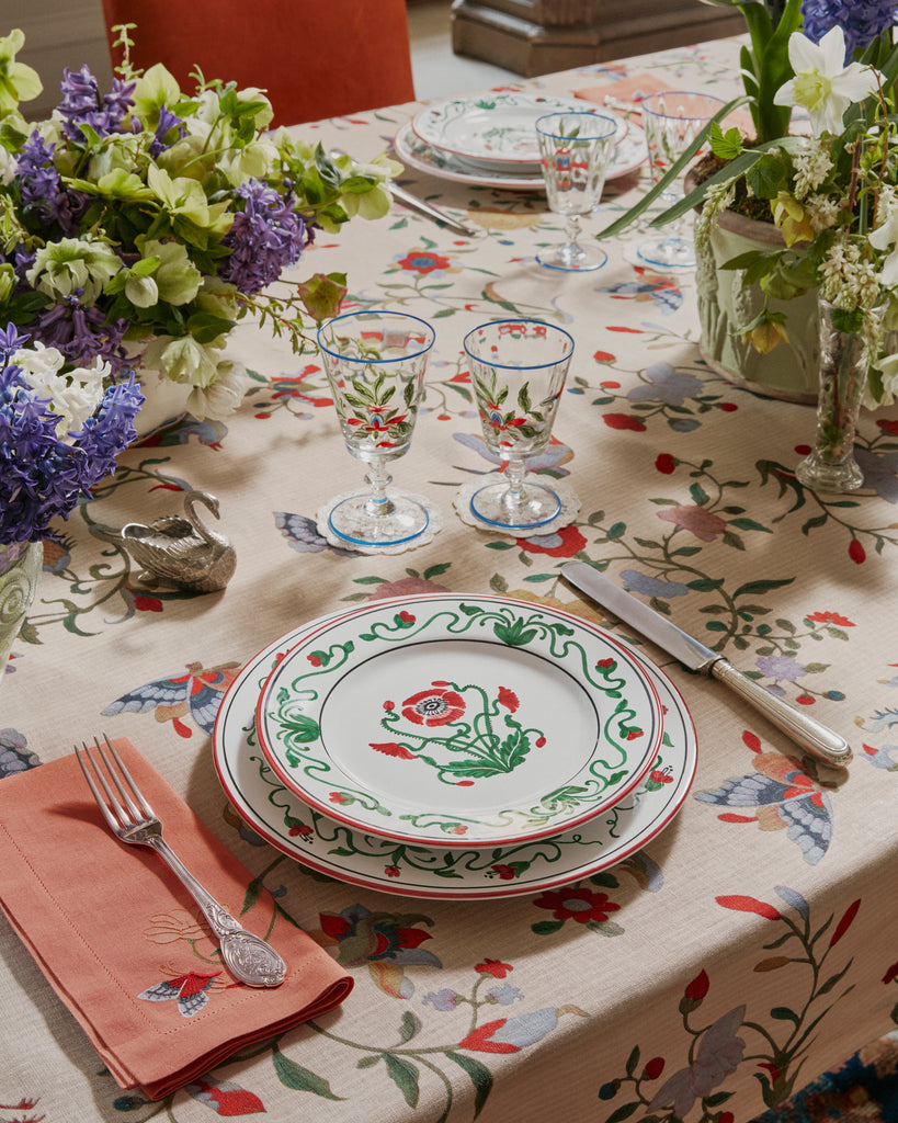 Owing to a mutual passion for interiors and true artisanal craftsmanship, together Rose, The Marchioness of Cholmondeley, and Martina Mondadori have created a tabletop collection inspired by original artefacts at Houghton Hall, North Norfolk. The collection includes table linens inspired by Rose’s 18th century hand painted silk bedroom wall covering, alongside napkins, porcelain plates and silver swans. All objects are carefully made in Italy following months of creative collaboration between the two design conspirators and friends.
