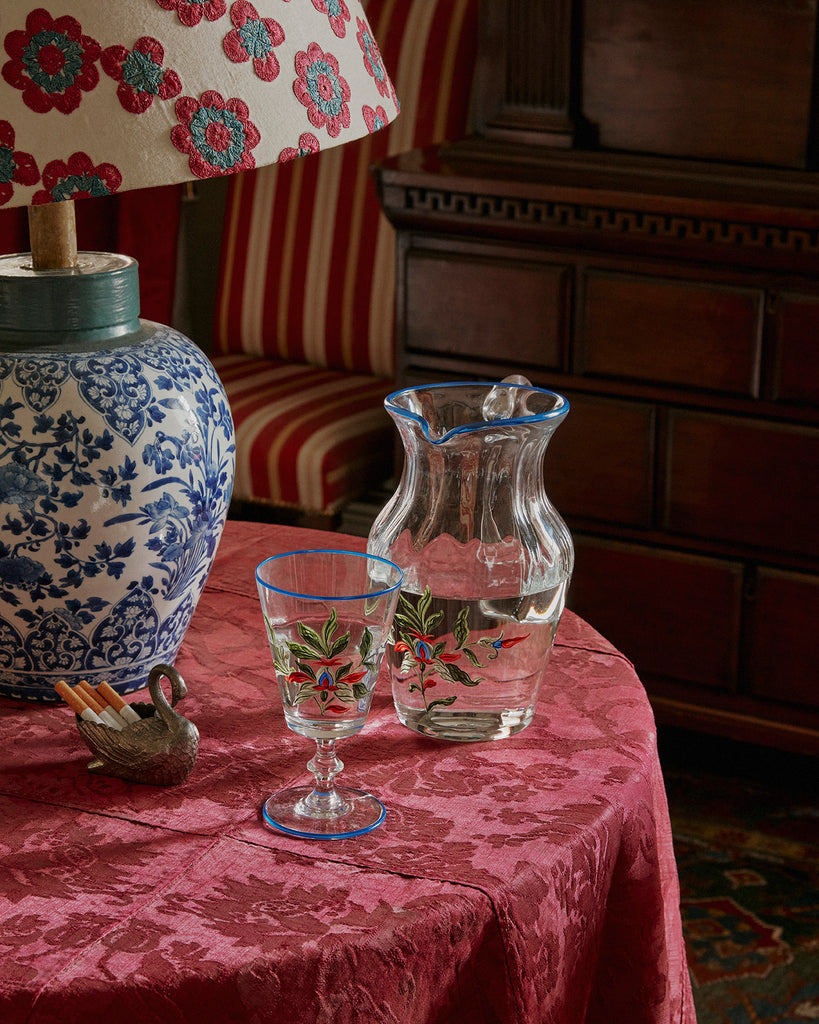 Exclusively made-to-order by skilled artisans on the Venetian island of Murano, this hand-painted water glass is inspired by the immaculately preserved antique stemware at Houghton Hall. Painted blue rims define the classic silhouette, while a botanical motif from an 18th century-style floral wallpaper motif adds artistic flair. Set your table with this hand-painted Murano glassware set for an elegant and refined formal table setting.