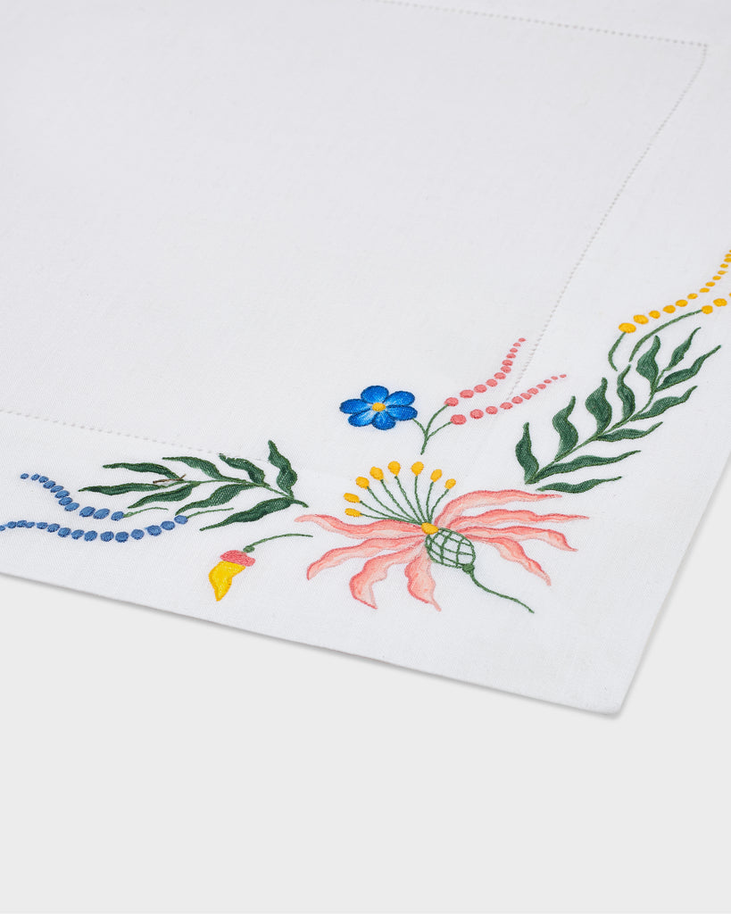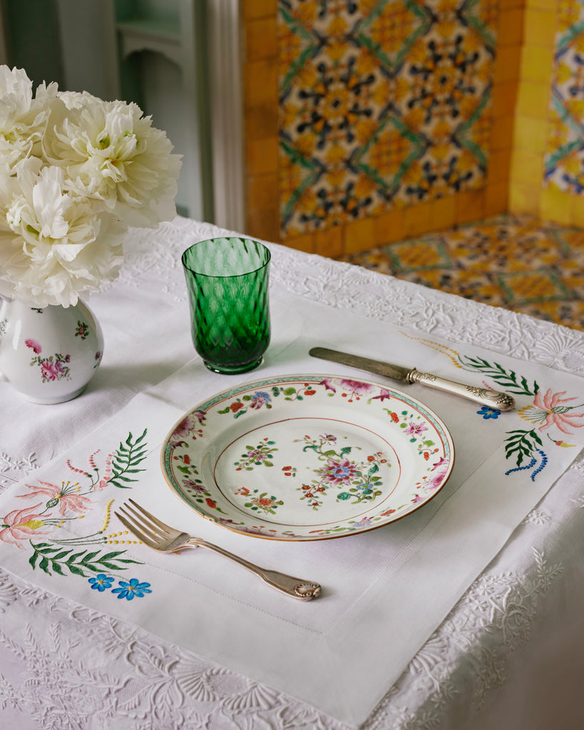 This exquisite placemat is made from pure linen by the renowned Atelier Houria Tazi in Morocco. A traditional technique of alternating hand-painting with embroidery lends each piece a refined, artisanal charm that brings sophistication to any table setting. Embellished with beautiful florals, it is a timelessly elegant piece that will add sophistication to your table.