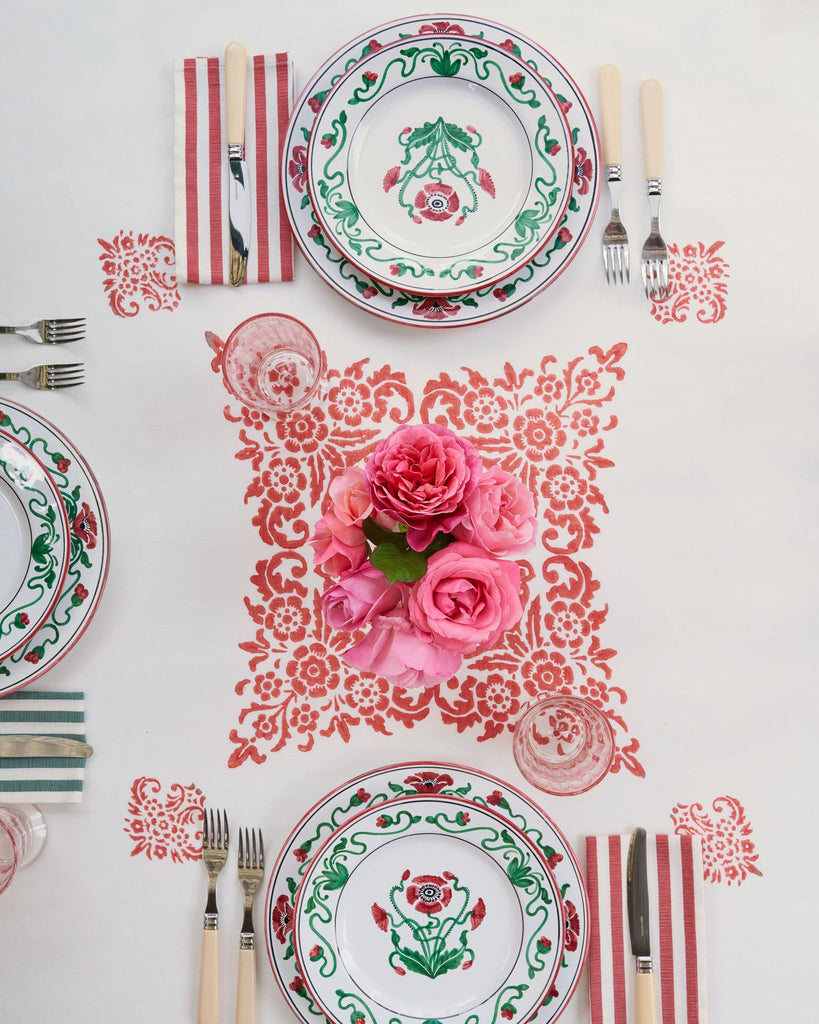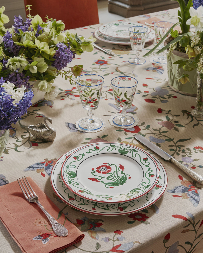 Owing to a mutual passion for interiors and true artisanal craftsmanship, together Rose, The Marchioness of Cholmondeley, and Martina Mondadori have created a tabletop collection inspired by original artefacts at Houghton Hall, North Norfolk. The collection includes table linens inspired by Rose’s 18th century hand painted silk bedroom wall covering, alongside napkins, porcelain plates and silver swans. All objects are carefully made in Italy following months of creative collaboration between the two design conspirators and friends.