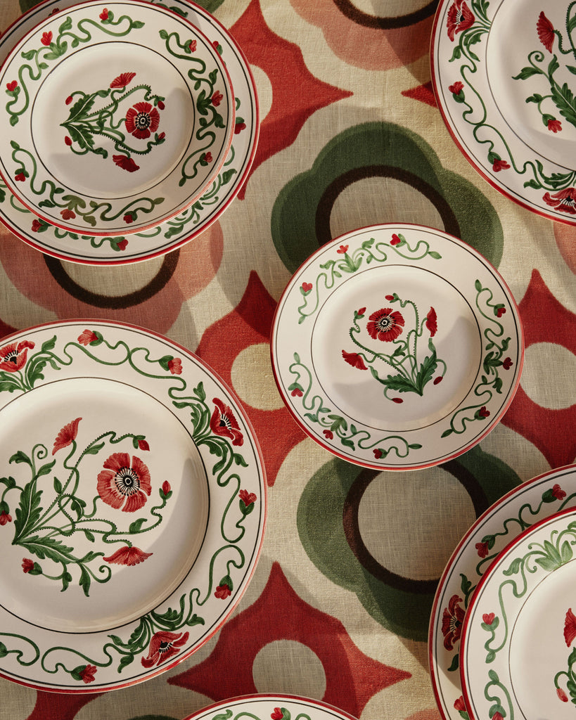 The Papavero charger plate is our rendition of an old English ceramic plate found at Houghton Hall. A central poppy motif is hand-painted with a border of stylized foliage, reminiscent of Art Nouveau designs. Handmade in Italy, each plate is complete with a second-fire glazing technique to create a subtle sheen. Layer with the Papavero dinner and dessert plates to create a quintessential country charm.