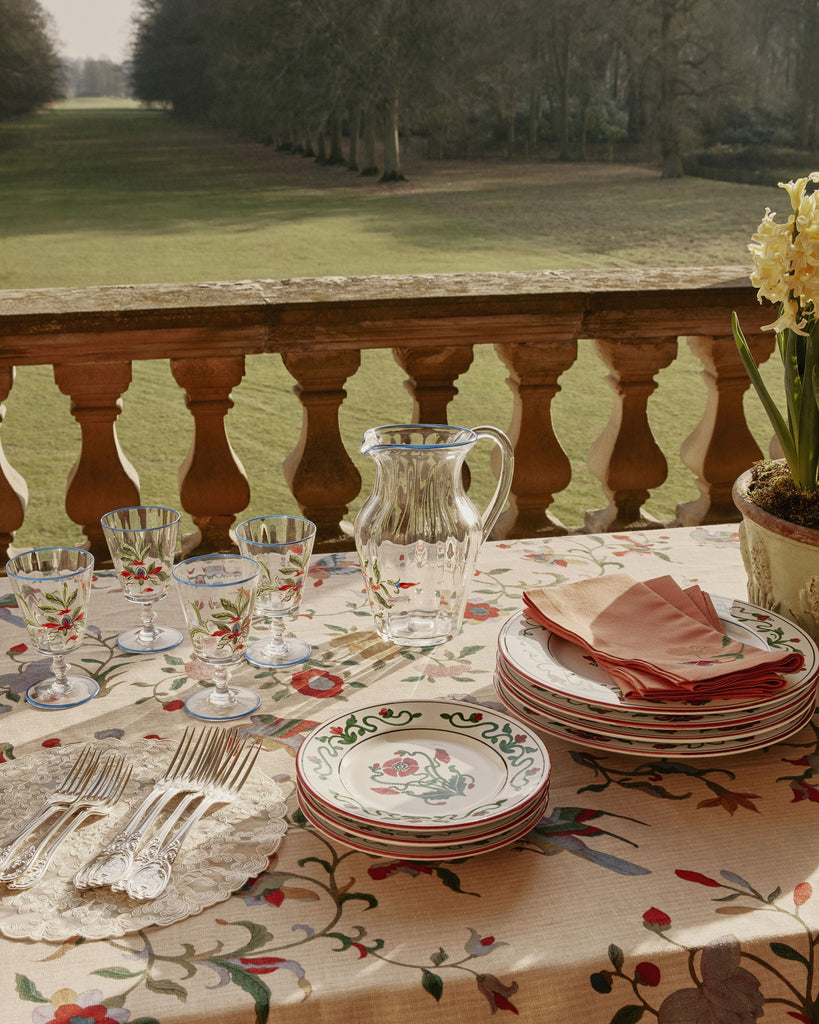 Owing to a mutual passion for interiors and true artisanal craftsmanship, together Rose, The Marchioness of Cholmondeley, and Martina Mondadori have created a tabletop collection inspired by original artefacts at Houghton Hall, North Norfolk. The collection includes table linens inspired by Rose’s 18th century hand painted silk bedroom wall covering, alongside napkins, porcelain plates and silver swans. All objects are carefully made in Italy following months of creative collaboration between the two design conspirators and friends.