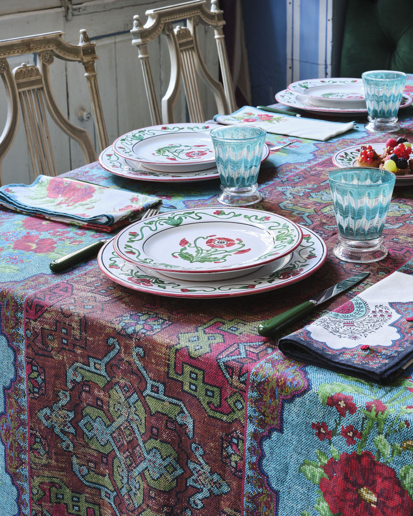 The Papavero dinner plate is our rendition of an old English ceramic plate found at Houghton Hall. A central poppy motif is hand-painted with a border of stylized foliage, reminiscent of Art Nouveau designs. Handmade in Italy, each plate is complete with a second-fire glazing technique to create a subtle sheen. Layer with the Papavero charger and dessert plates to create a quintessential country charm.