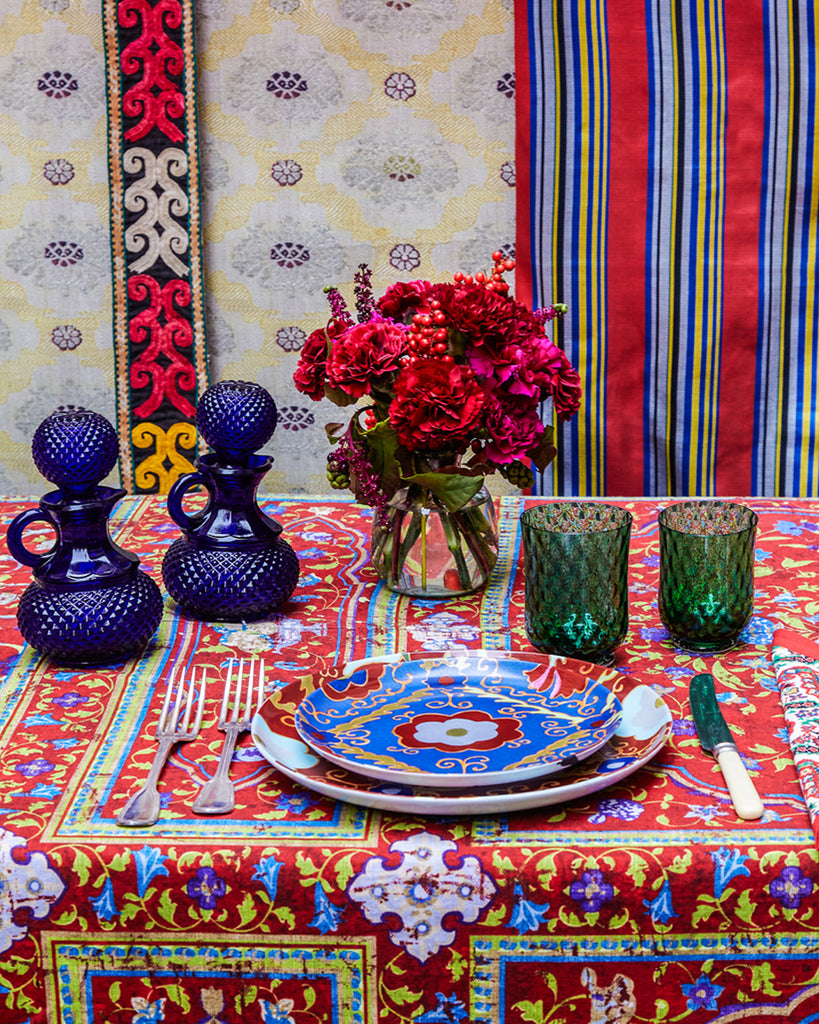 Inspired by the elegant wall frescoes in Rajput palaces, this exuberant design features floral bouquets and vines overflowing urns set amidst decorative arches and borders. Adorn your table with the Rubino Table Linen for a sophisticated and lavish celebratory mood. Pair with the Rubino placemats and Natale napkins to complete the look. This D'Ascoli linen is an exclusive to Cabana.