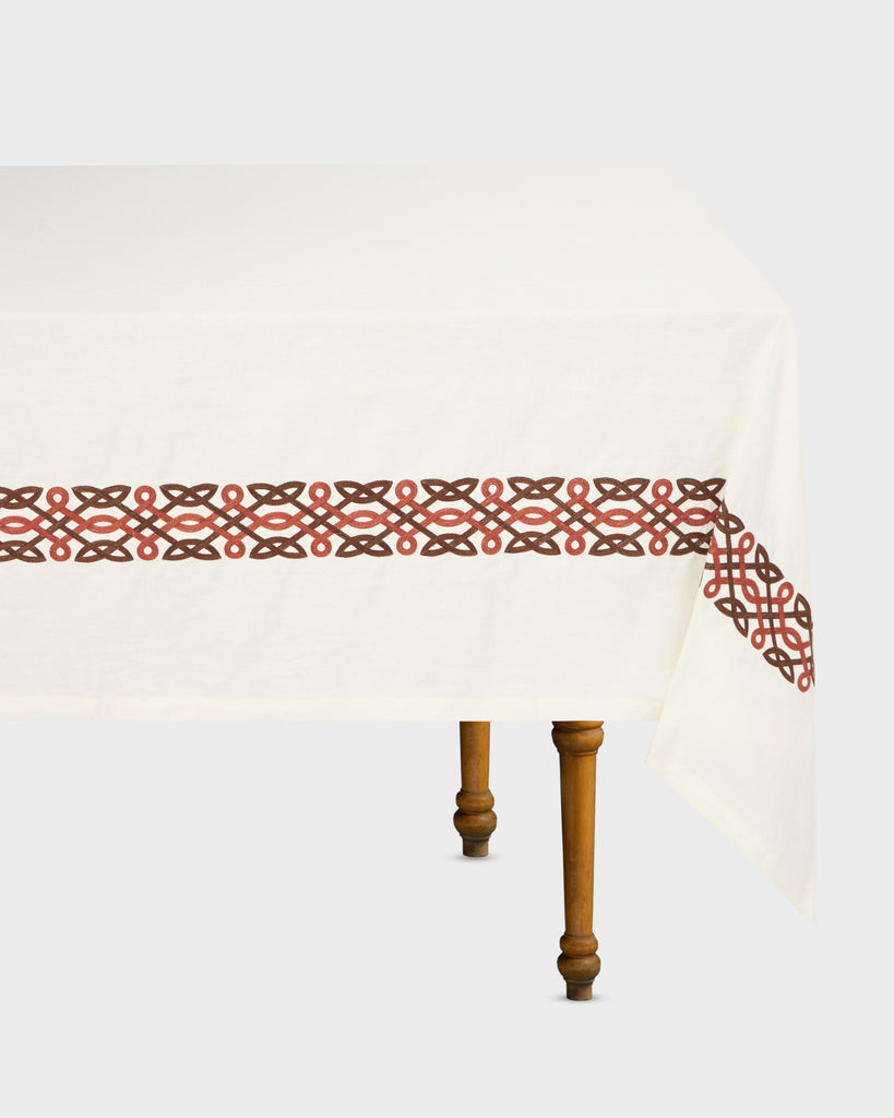 The Terracotta Collection is a stunning ode to Italy's visual identity, defined by the rich, earthy tones of the country’s natural landscape, its celebrated terracotta rooftops and sunbaked joie de vivre. The Terracotta Embroidered Linen Tablecloth in ivory is made from 100% linen and features an intricate embroidered border in a geometric pattern inspired by typical interlacement bands from the 9th century. Wrapped in a matching patterned bag, it offers an elegant solution for storage.