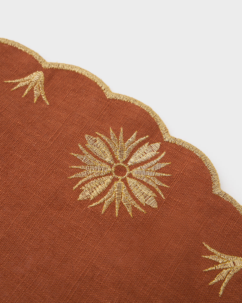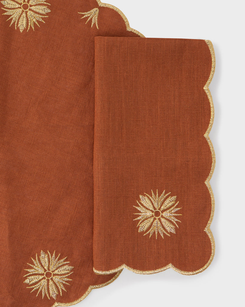 This elegant bundle pairs the Terracotta Embroidered Round Placemat and the matching Embroidered Napkin, both crafted from soft linen and adorned with intricate embroidery in gold. Each piece features delicate floral medallion motifs in warm, earthy hues, framed by graceful scalloped edges. Together, they create a harmonious and refined table setting that celebrates natural beauty and artisanal craftsmanship—perfect for both everyday dining and special gatherings.