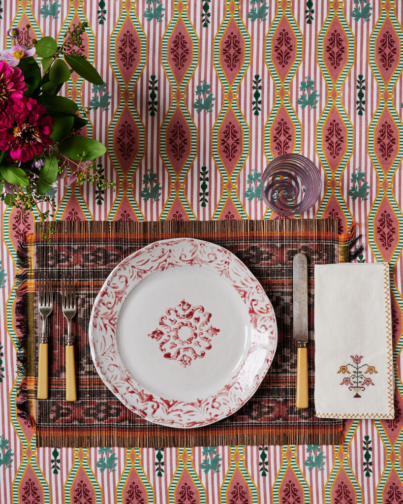 Inspired by the geometric forms of traditional Ikats, this boldly patterned placemat will add instant energy and character to your table setting. Hand-woven on a loom, these placemats are sturdy yet flexible, and can be rolled up and stored away for convenience in between uses. Set of two.