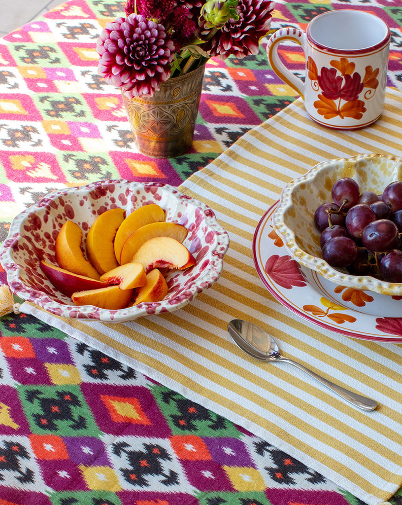 Handmade in Puglia with heart and tradition, the shallow Speckled Bowl features a scalloped edge and decorative border that undulates all around. These versatile bowls can be used to plate anything, from fruit or nuts to a dinner side dish. Ceramic making in Puglia has flourished in Italy since antiquity. Known for its ‘schizzato’ speckled paint style, Puglia’s splatterware is considered part of the region’s rich heritage. Our Speckled Collection is an homage to this cultural tradition, hand-painted in Puglia in a variety of vibrant colors.