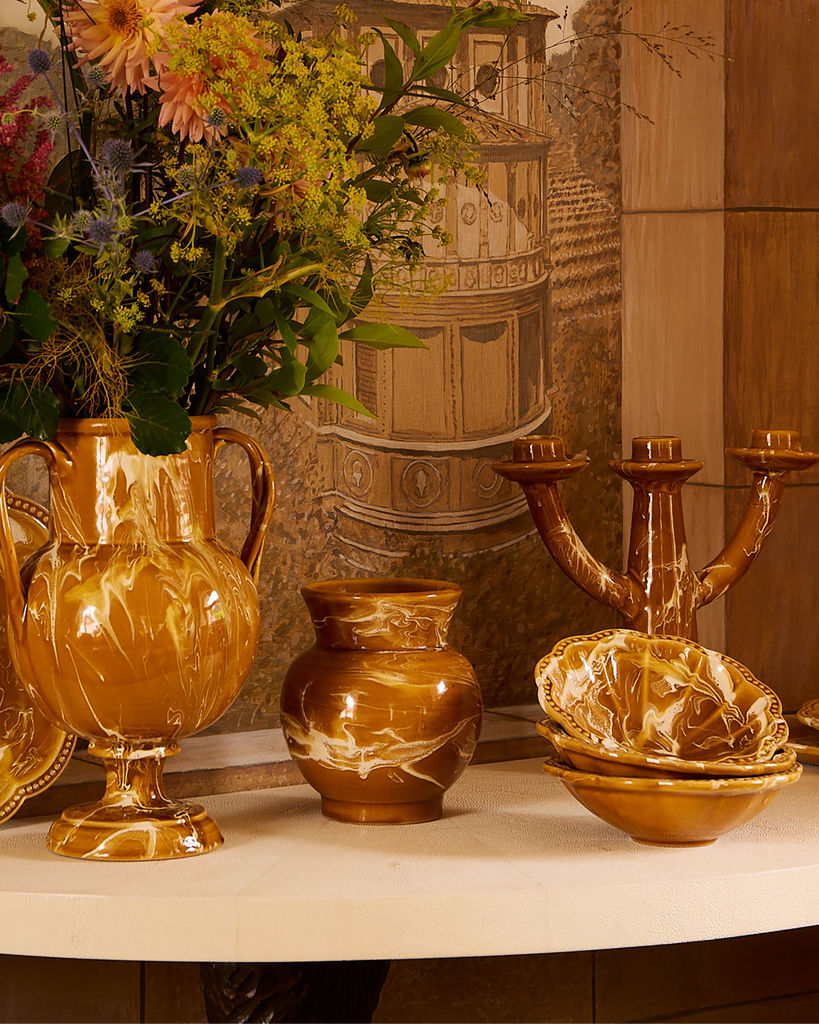 The Terracotta Collection is a stunning ode to Italy's visual identity, defined by the rich, earthy tones of the country’s natural landscape, its celebrated terracotta rooftops and sunbaked joie de vivre. The Marbled Vase is hand-painted in Puglia using the traditional ‘schizzato’ speckled technique. It features a sculptural form with a marbled pattern in warm hues. Each piece is hand-dipped, resulting in a distinctive marbled finish that celebrates the artistry of Italian craftsmanship.