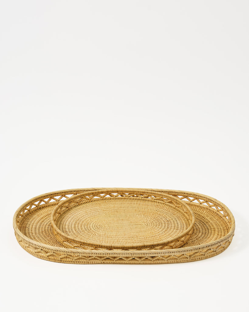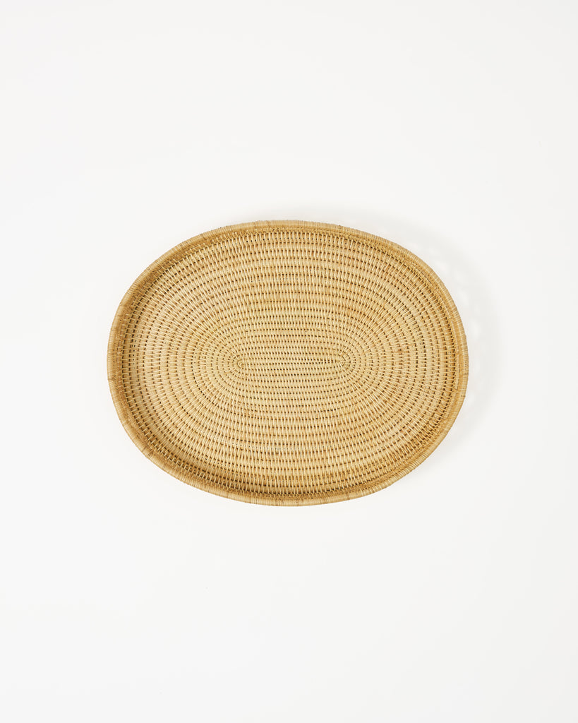 The Woven Sabbia Oval Tray is handwoven from a sustainable rattan. The appealing natural finish emphasises the texture and intricacy of the weave and adds a touch of rustic charm to any setting. These delightful trays are available in two sizes, this one being the medium.