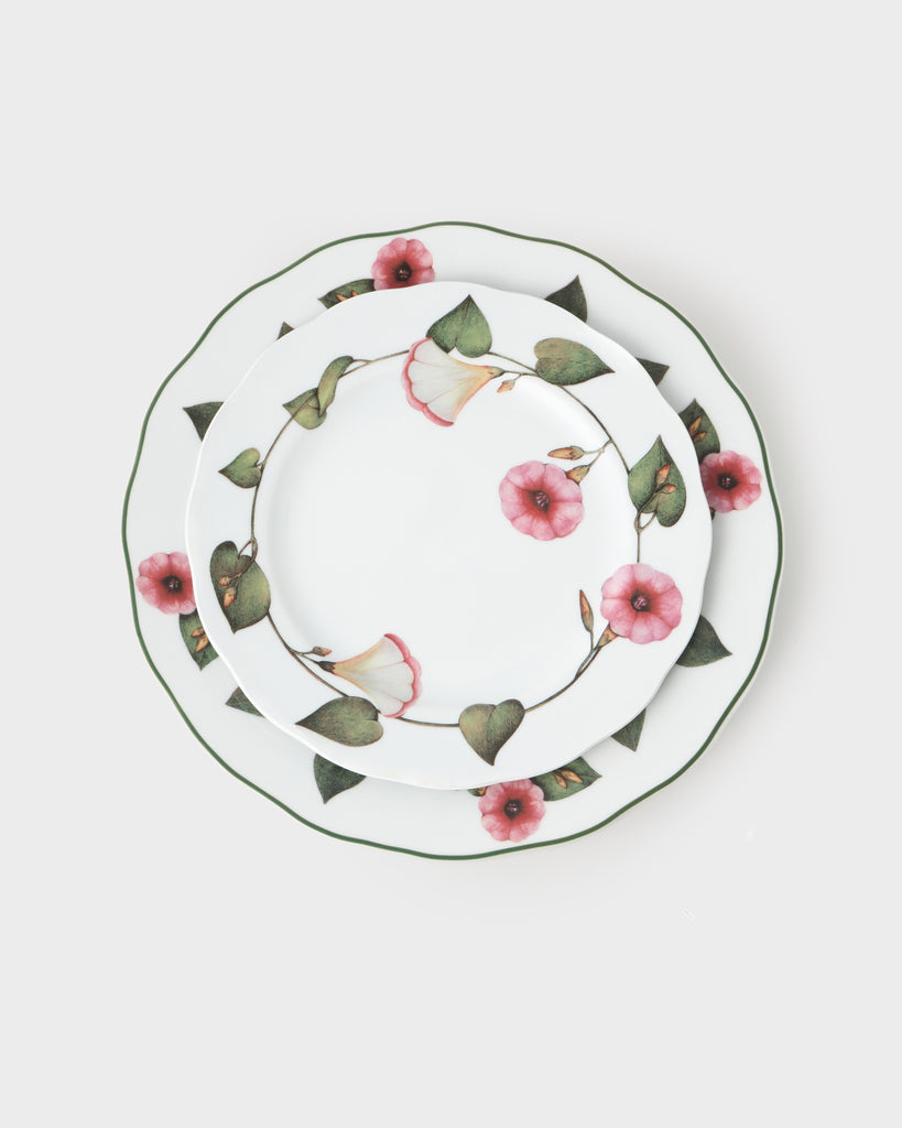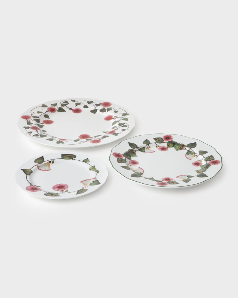 The Ciclamino Porcelain Dessert Plate showcases a delicate wreath of pink cyclamen blossoms and lush green vines. Simple yet chic, these plates are perfect for both casual and formal dining settings.