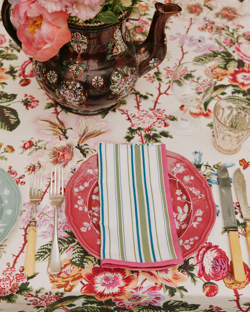 The Livinia Napkins feature an elegant printed stripes in green with blue accents and pink trimming. Each napkin is made with hand-spun, hand-woven cotton. Set of four. Exclusively for Cabana.