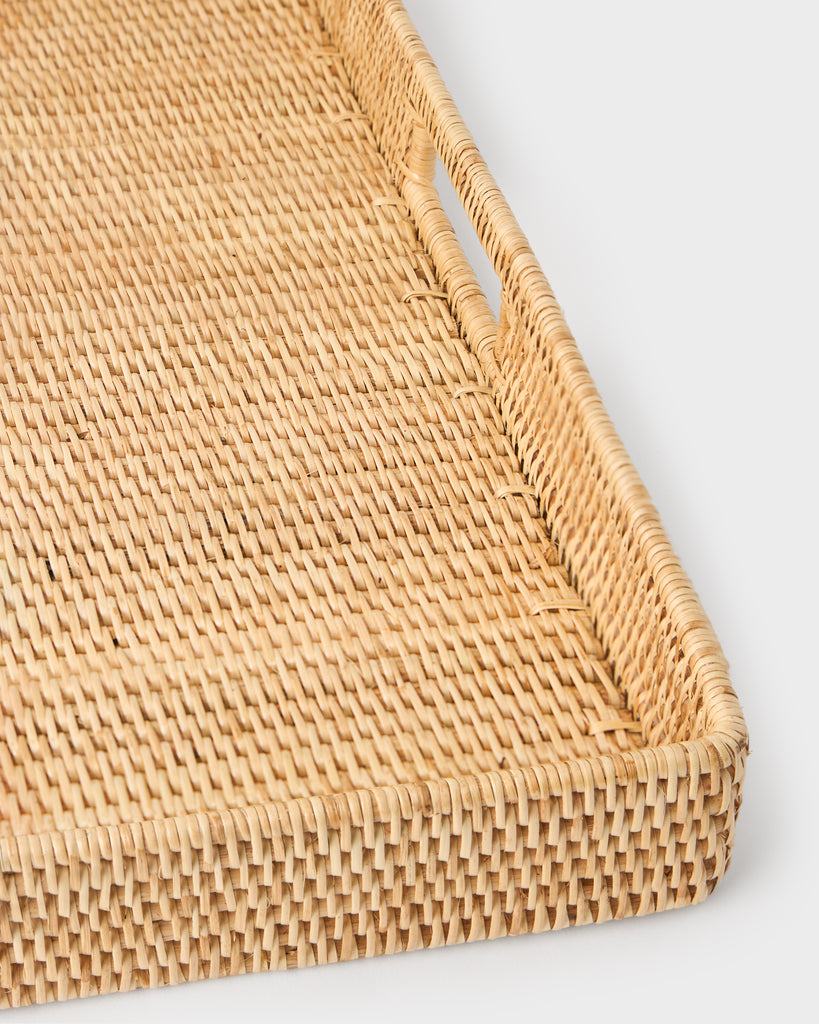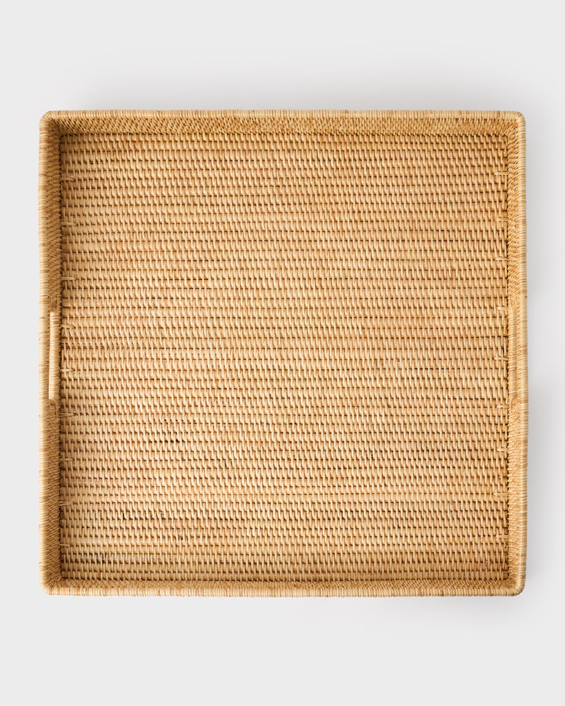 Simple and elegant, the Woven Sabbia Square Tray is hand-woven from natural fibres in a tight weave. Its sturdy square shape with handles offers both style and function, perfect for serving drinks and appetizers, or set upon an ottoman.