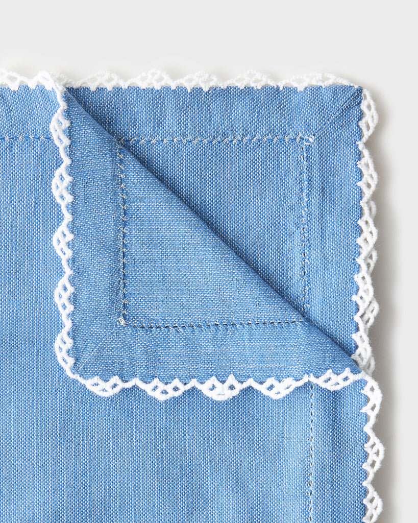 The Beatrice placemats and napkins set is made of cotton and embellished with a white scalloped embroidery border. They are simple yet delightful, and will stand out against a brilliantly patterned table linen.