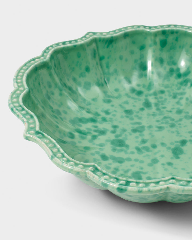 Handmade in Puglia with heart and tradition, the Speckled Serving Bowl features a scalloped edge and decorative border that undulates all around. Use it as a salad bowl or to display fruit. Its vibrant splatter pattern will liven up any space. Pair with our Speckled Mini Bowls in a variety of colors to create our signature mix and match look.