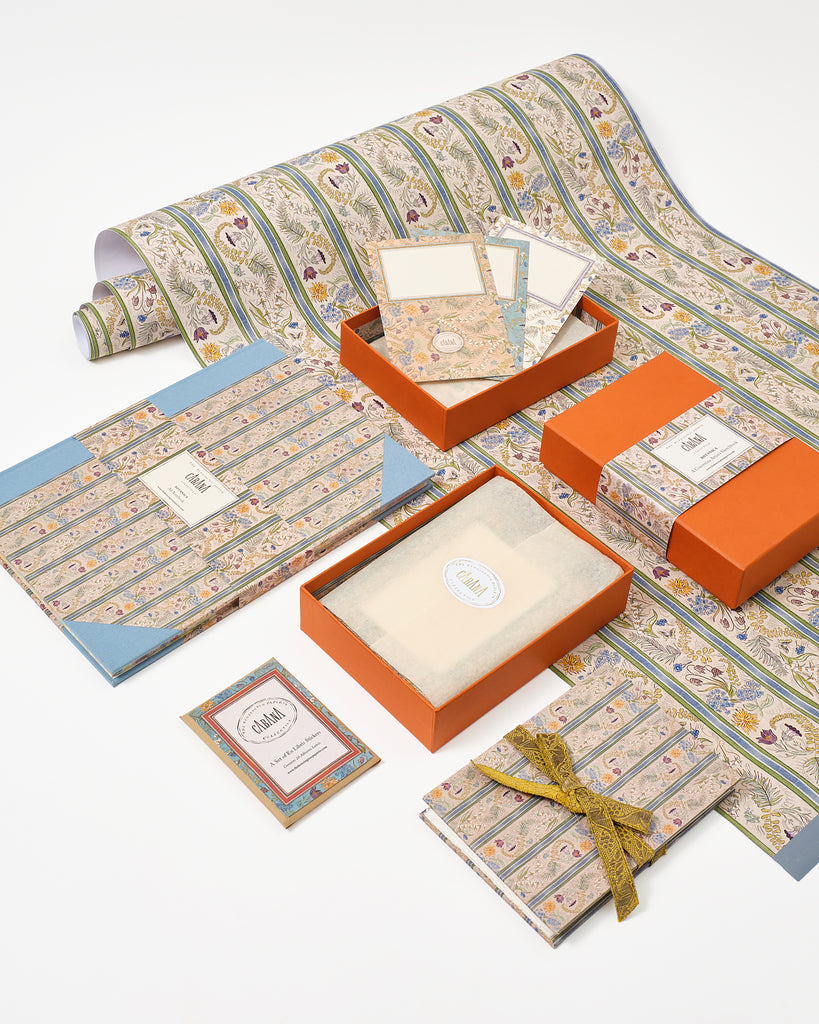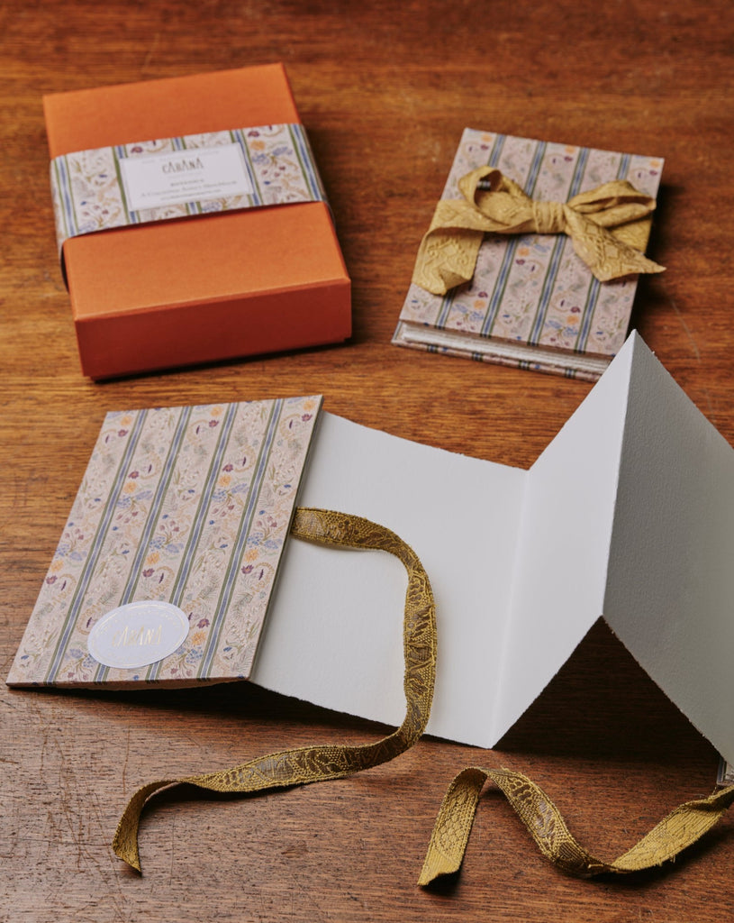 Printed in London and case-bound by our maker in Glasgow, the compact casing of this concertina sketchbook defies its capacious internals. Using the finest Hahnemühle Watercolour Paper (cold pressed, 300grams) with hand-deckled edges, and finished with a beautiful antique saffron-dyed silk ribbon, this is a truly special gift for any artist who likes to watercolour en plein air and in style. This beautiful book arrives in an exquisite keepsake box, lined in the Botanica print.