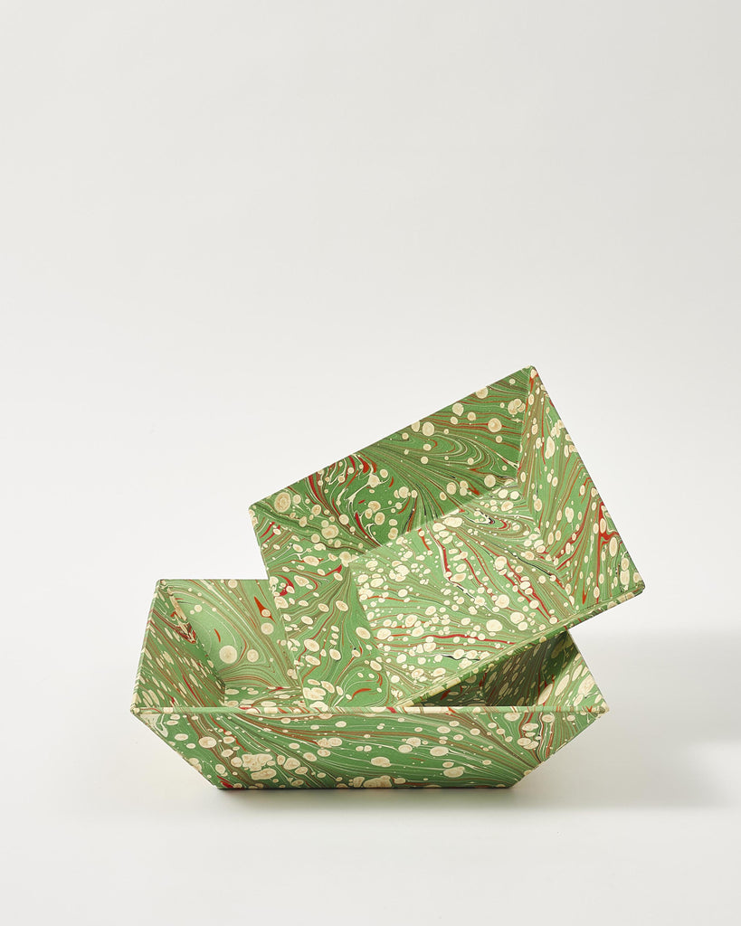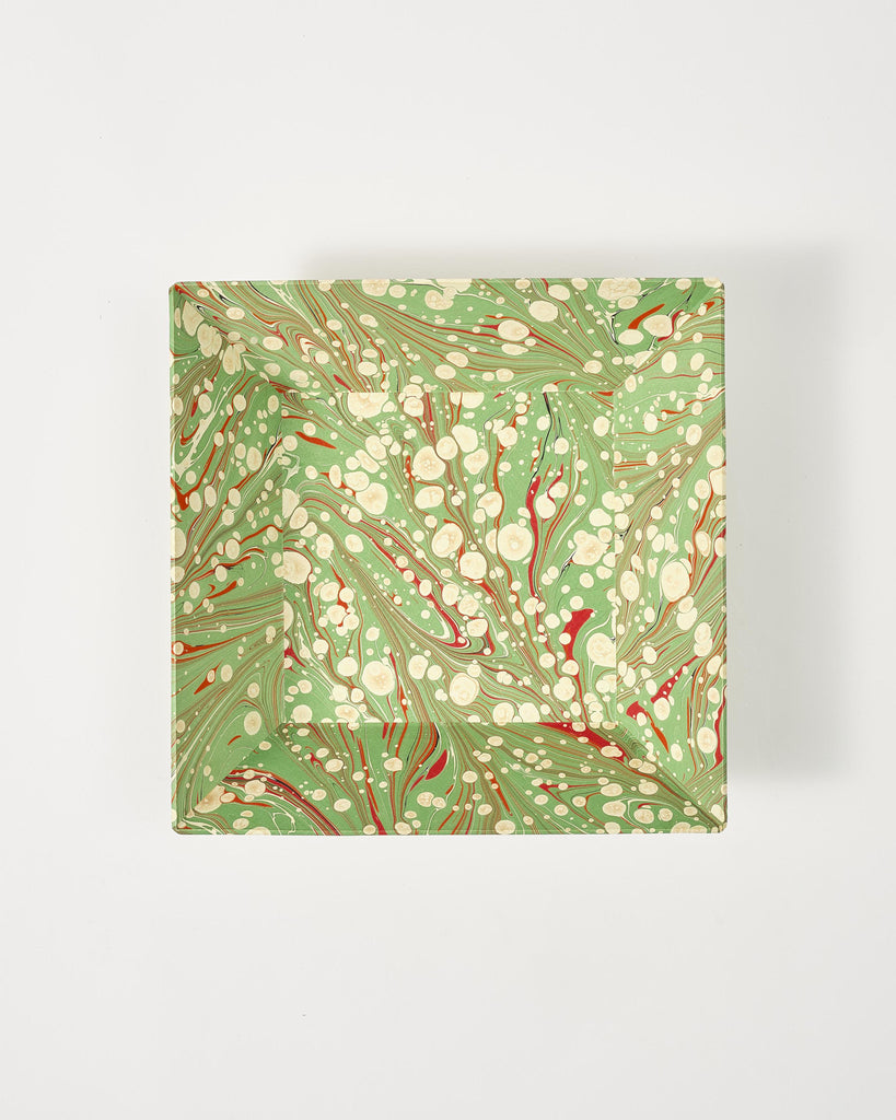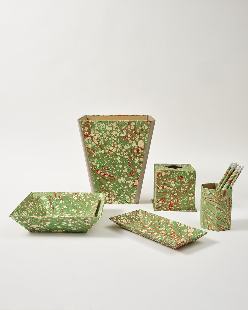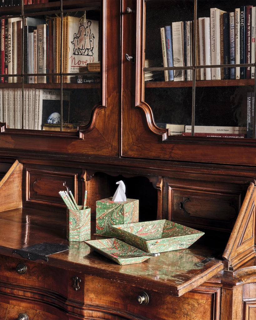 The Marbled Vide Poche is handmade in Italy by Venetian artisans using marbled paper—a technique steeped in history and known for its mastery of abstract decoration. The marbled pattern, created through the meticulous combination of pigments, oils, and water, renders each pencil a unique work of art, impossible to replicate exactly. Available in two beautiful colours, yellow and green. These trays can be used as both decorative and functional objects in your workspace.