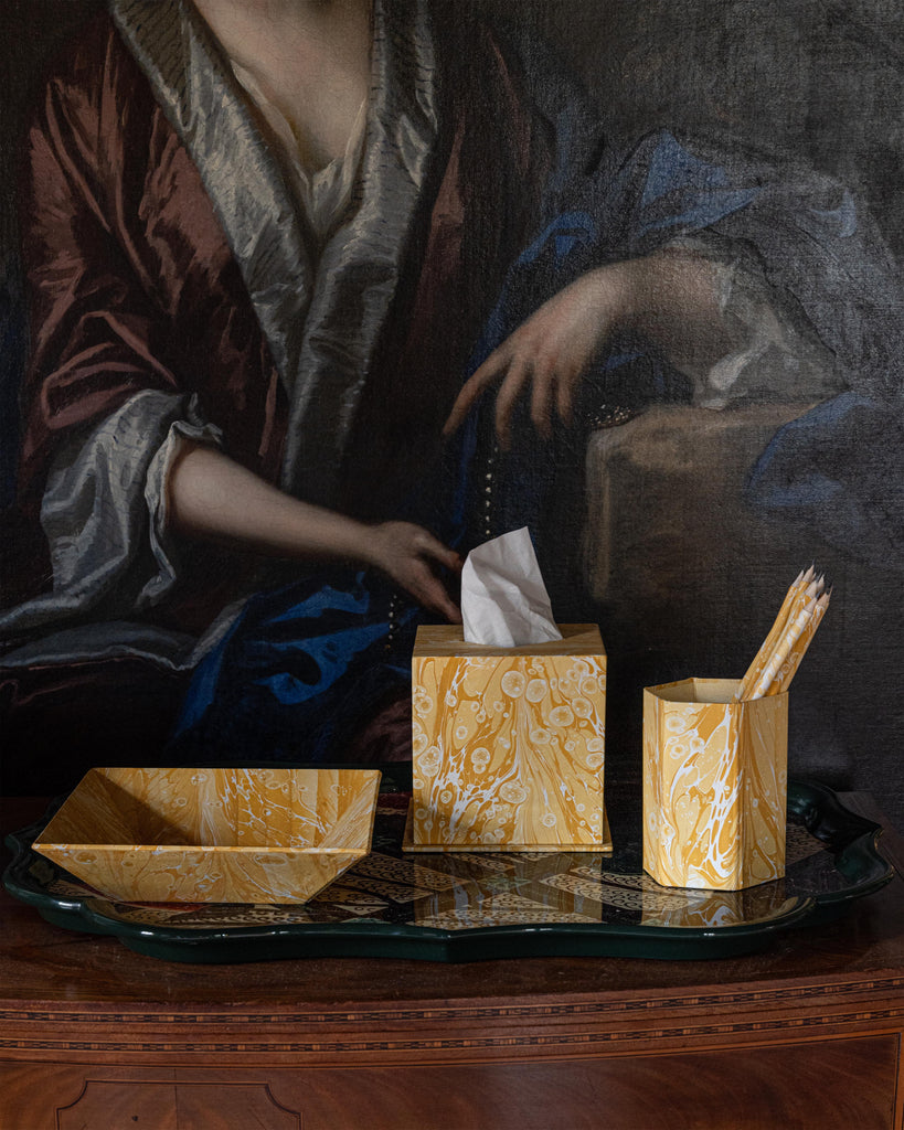 The Marbled Vide Poche is handmade in Italy by Venetian artisans using marbled paper—a technique steeped in history and known for its mastery of abstract decoration. The marbled pattern, created through the meticulous combination of pigments, oils, and water, renders each pencil a unique work of art, impossible to replicate exactly.