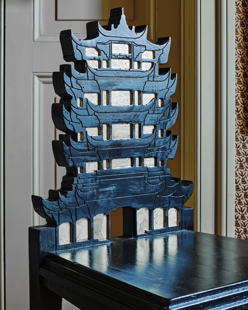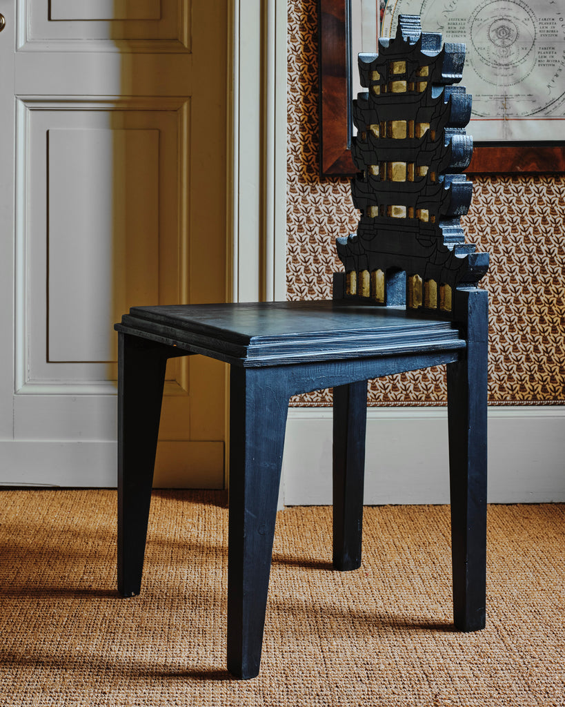 An unusual pair of black lacquered chairs with pagoda-style backs and gilt-painted carved detailing. Their bold silhouette and stylised ornamentation evoke chinoiserie design through a theatrical lens.