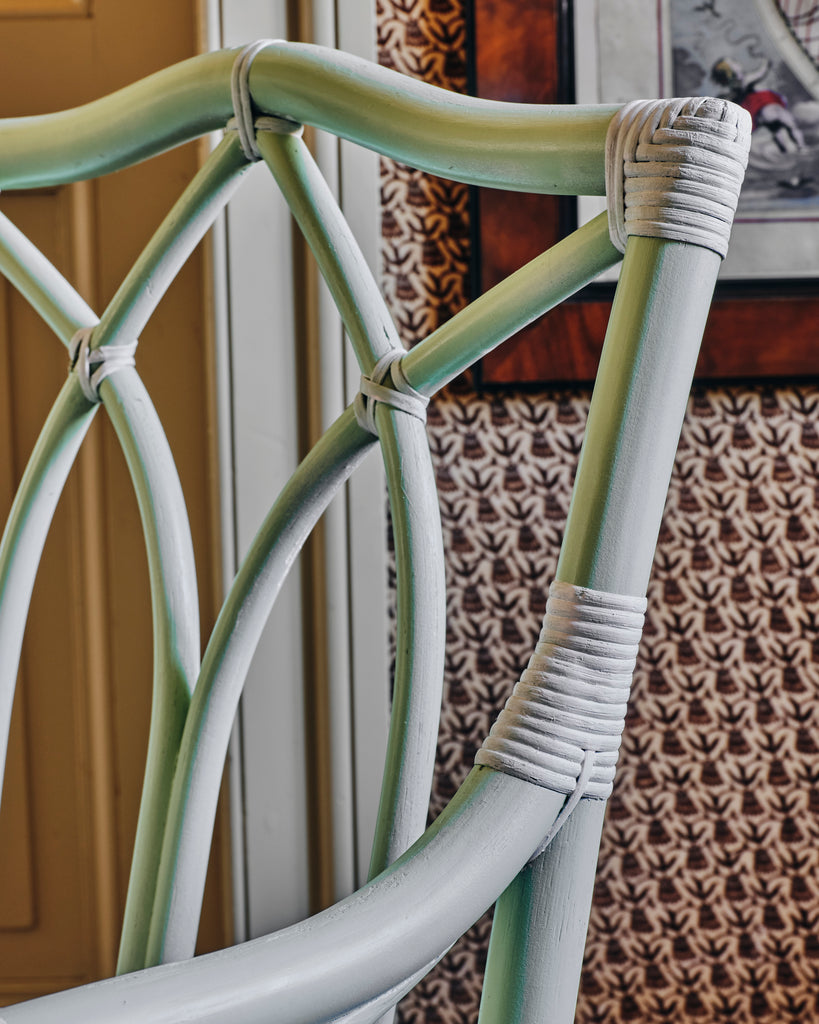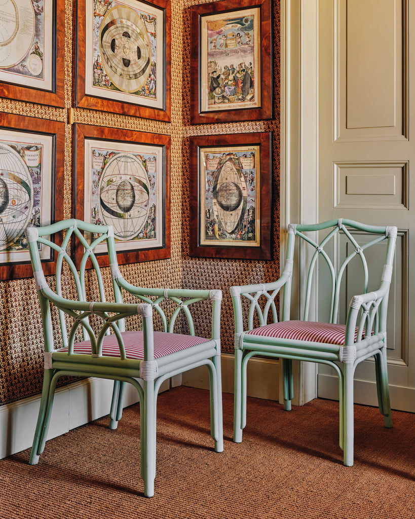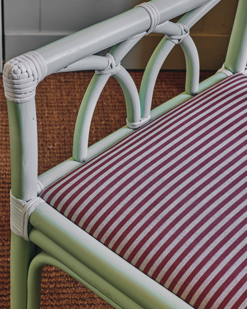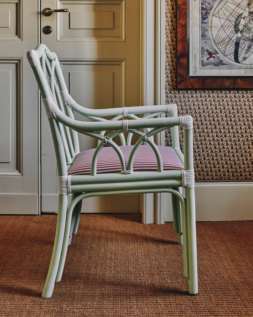 A set of six dining chairs that celebrate the poetic geometry of Gothic architecture. Painted in a whimsical green and white palette, the cane frames feature graceful arch motifs that lend lightness and height. Each chair is fitted with a bespoke cushion in a crimson and ivory Venetian stripe textile, marrying structure with softness. Perfect around a painted trestle table or scattered along a grand corridor for an ecclesiastical touch.