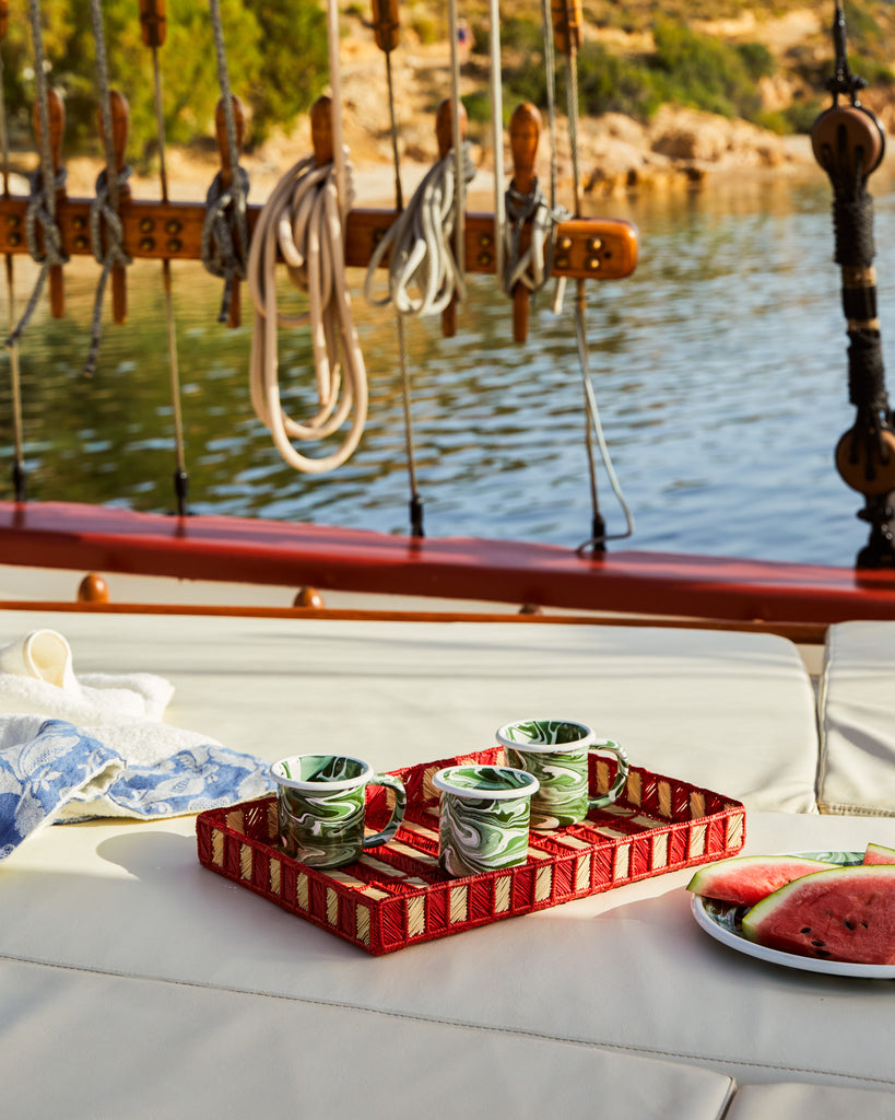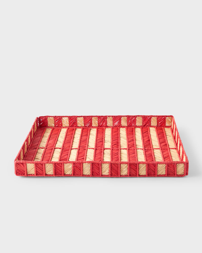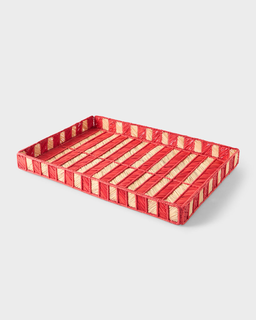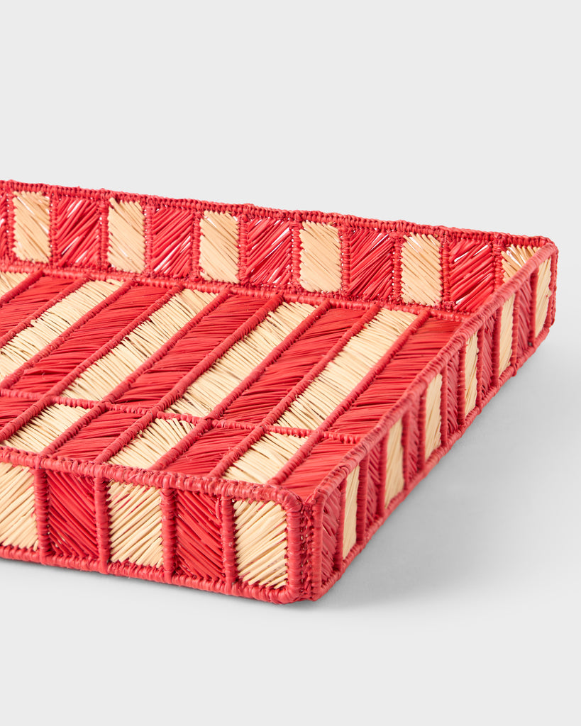 Our exclusive Magnetic Midnight tray is a unique statement piece that reflects a modern aesthetic imbued with a love for tradition and craftsmanship. Its red and natural striped pattern will add a lively touch to any setting. It is hand-crafted in Colombia by generations of artisans, known for their traditional weaving techniques. Each tray is a labor of love, taking almost two weeks to create. Use it to delight your guests when offering coffee or other small treats.