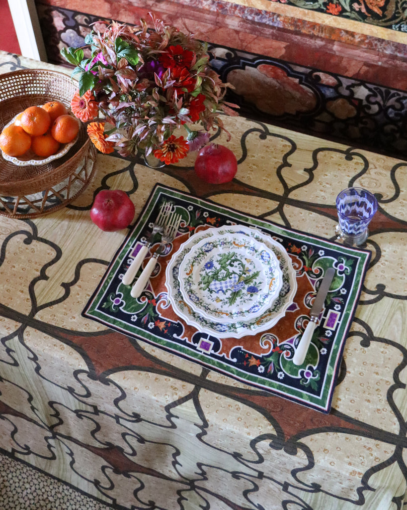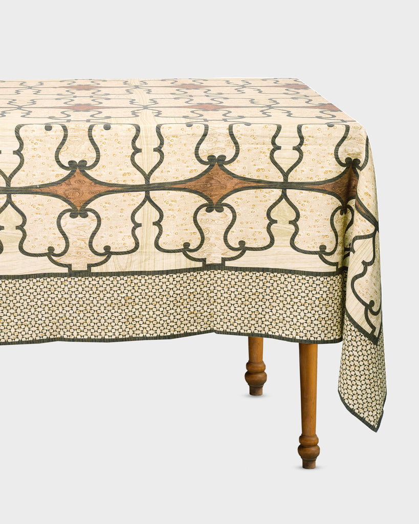 The Urbino Tablecloth features a bold ornamental design printed on 100% linen in trompe l’oeil effects imitating wood veneers, offered in two colors, “brun” and “blonde." Its rich pattern will add depth and originality to your autumn and winter table settings.