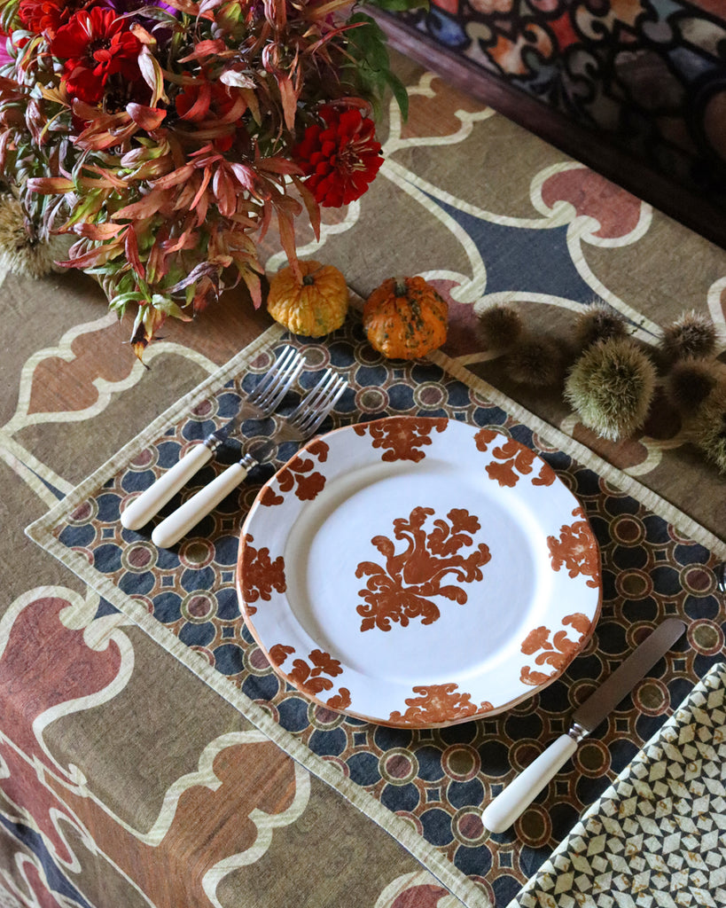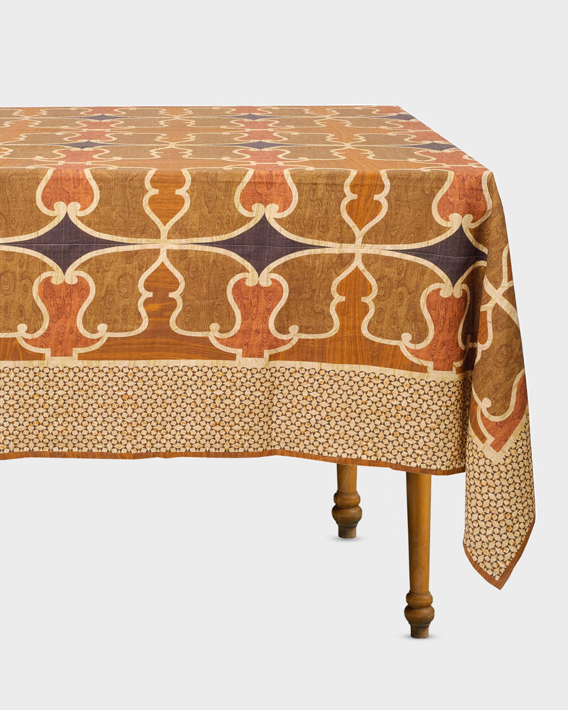 The Urbino Tablecloth features a bold ornamental design printed on 100% linen in trompe l’oeil effects imitating wood veneers, offered in two colors, “brun” and “blonde."  Its rich pattern will add depth and originality to your autumn and winter table settings.
