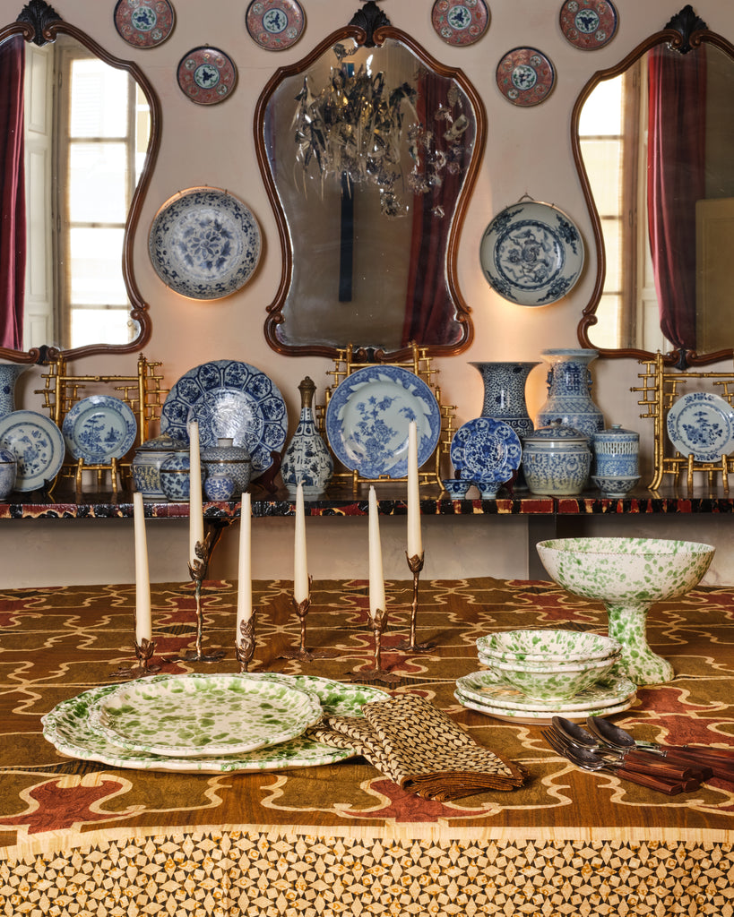 The D'Ascoli x Cabana Trompe L’Oeil collection is inspired by Renzo Mongiardino and the home he created in Milan for the mother of Cabana founder Martina Mondadori. The Master adored “trompe l’oeil,” the visual technique of fooling the eye with decorative painting that creates the illusion of different materials. Two themes Mongiardino returned to again and again were Marquetry - inlaid wood veneers, and Pietra Dura - inlaid stones. For Cabana, D’Ascoli has created a sumptuous layering of faux bois marquetry and faux marbre pietra dura effects printed on linen and on hand-spun, hand-woven cotton with hand embroidery.