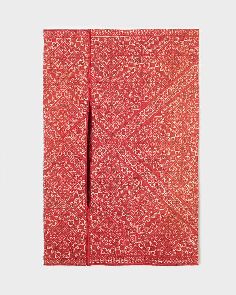 A sumptuous deep red silk panel, embroidered with intricate geometric and floral motifs, offering a glimpse into Morocco’s storied textile heritage. Ideal for conversion into a traditional Moroccan cushion, this piece exudes timeless elegance.